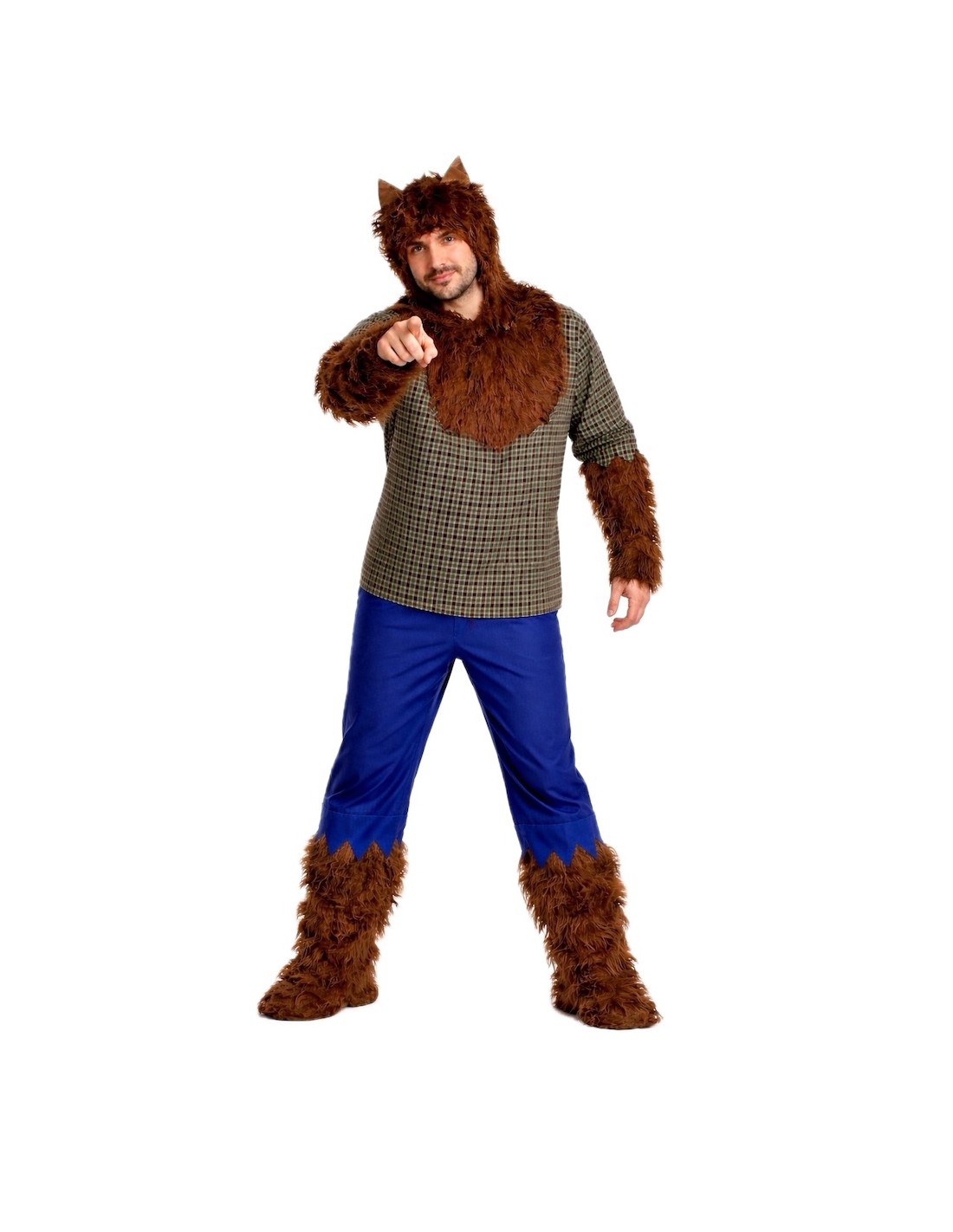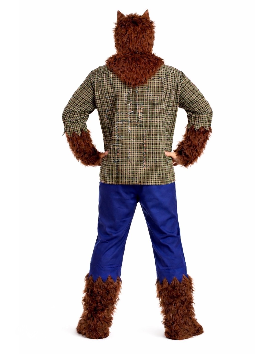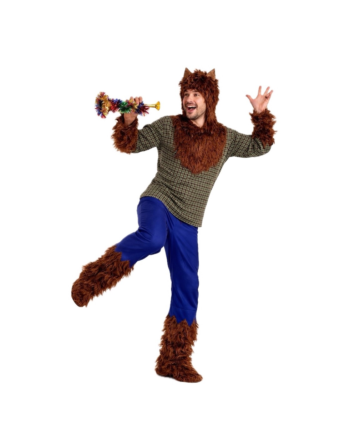 Dieses klassische Kostüm besteht aus einem langen und weiten Hemd aus Polyester, das wie Flanell aussieht. Der Verschluss am Hals erfolgt auf der Rückseite mit Klettverschluss. Die Ärmel sind mit gestrickten Handschuhen und synthetischem Fell versehen, ebenso wie die Brust und der Overall des Kostüms. Der untere Teil besteht aus einer Hose mit einem elastischen Bund und einer kleinen Innentasche. Sie ist aus dichtem Polyester mit synthetischem Fell, das die Waden und Füße bedeckt, und ist mit einem Gummiband für eine bessere Passform und Bequemlichkeit versehen.