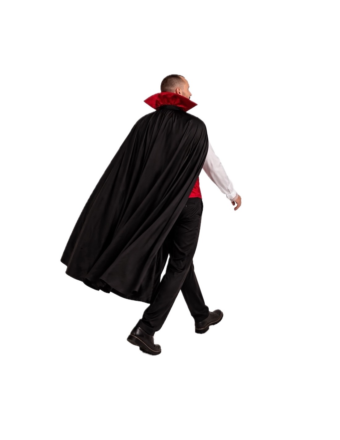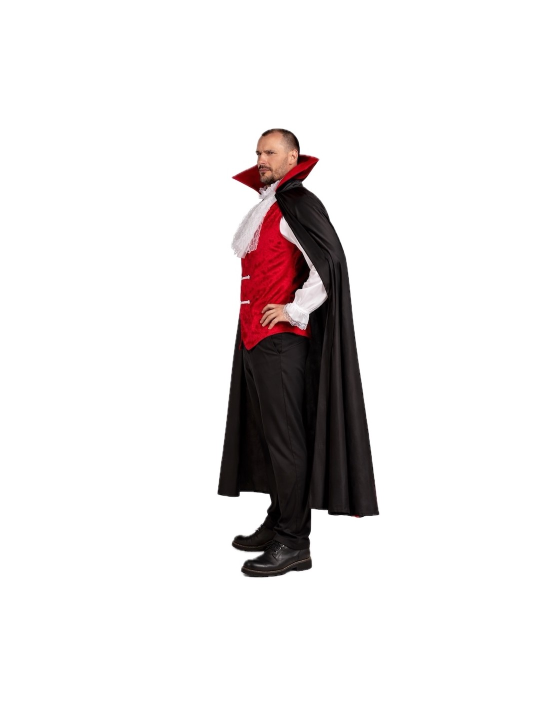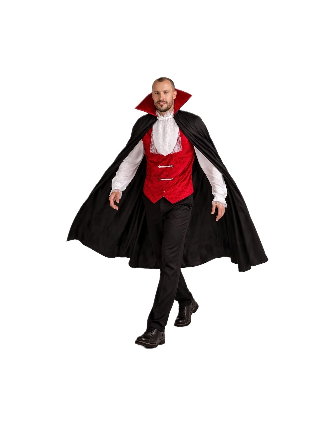 Hochgeschätztes Vampir-Kostüm, elegant und voller Details. Enthält ein T-Shirt aus weichem, halbelastischem Stoff mit Spitze und gerafften Manschetten, sowie ein integriertes bordeauxrotes Samtweste, das den Eindruck vermittelt, es handle sich um zwei Teile, verziert mit silbernen Knöpfen und Bändern. Rückseitiger Klettverschluss und elastischer Rücken für perfekte Passform. Das T-Shirt wird mit einem Spitzenhalstuch vervollständigt. Die Strickhose mit Gummibund und Innentasche sorgt für Komfort. Der ikonische Umhang mit strukturiertem Samtkragen und Verzierungen mit silbernen Knöpfen und Bändern wird vorne mit Klettverschluss geschlossen. Ein harmonisches und ideales Set, um auf jeder Party hervorzustechen.
