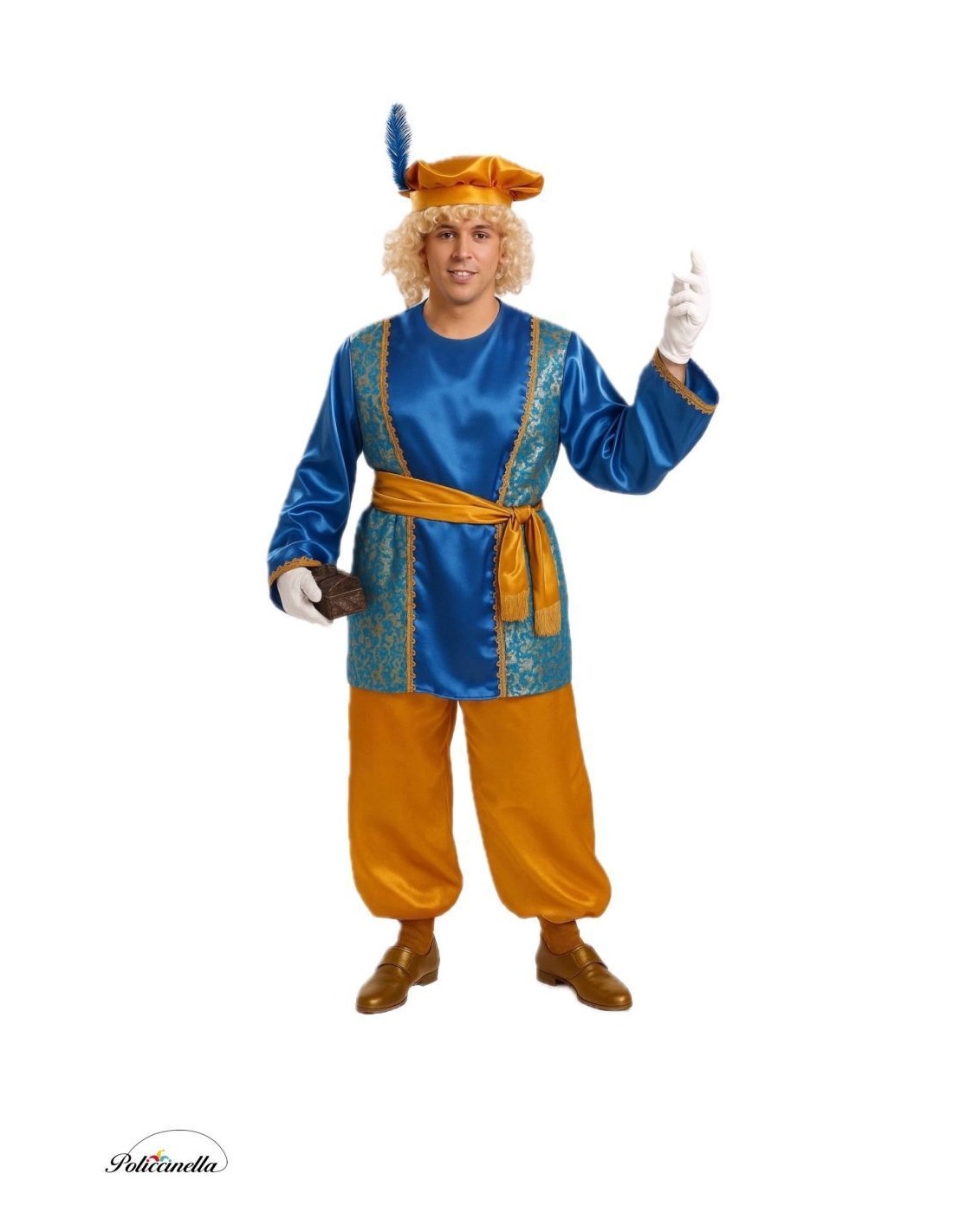 Traditionelles Kostüm eines Pagen, elegant und voller Details. Enthält ein Hemd aus weichem Satin mit Klettverschluss am Rücken, verziert auf der Vorderseite mit goldenem Brokatstoff und zarter Borte, die auch an den Ärmeln zu finden ist. Das Set wird vervollständigt durch eine Hose mit Gummizug an Taille und Knöcheln, einen Gürtel und die charakteristische Mütze, verziert mit einer Feder und einem Gummiband hinten für eine bequeme Passform, alle aus demselben passenden Stoff gefertigt. Ein auffälliges und bequemes Outfit für den Anlass!