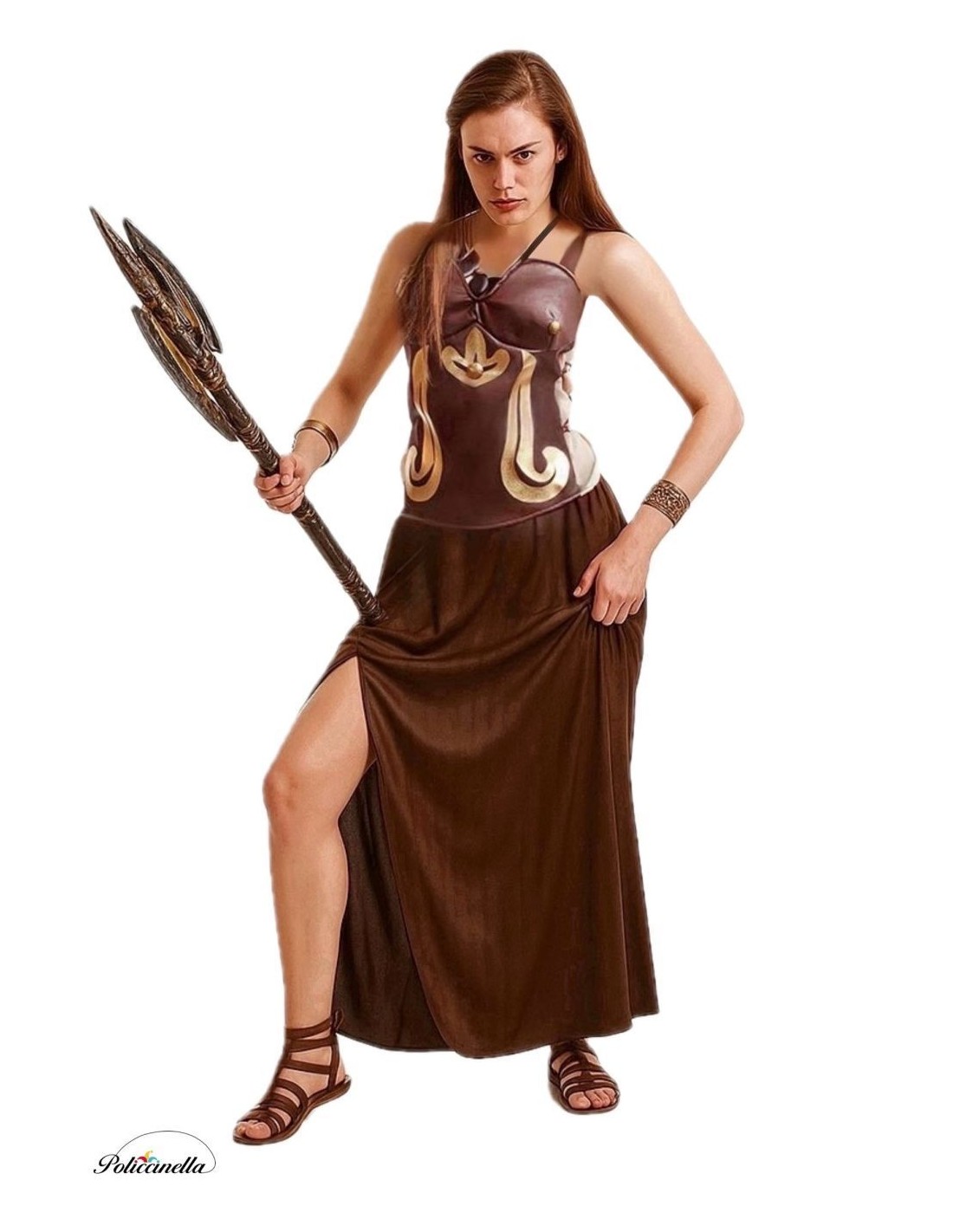 Dieses elegante Kriegerkostüm, das aus weichem halbelastischem Maschenstoff gefertigt ist, verfügt über ein Oberteil mit herzförmigem Ausschnitt. Die Vorderseite des Oberteils ist aus Polyester mit Ledereffekt gefertigt, verziert mit goldenen Zeichnungen und drei ähnlichen bronzefarbenen Stücken. Die Rückseite des Oberteils besteht aus weichem halbelastischem Maschenstoff und verfügt über Schlaufen an den Seiten und Bänder zum Binden in der charakteristischen mittelalterlichen Zickzack-Form, sodass das Oberteil an die Figur angepasst werden kann. Der untere Teil des Kostüms besteht aus einem Rock aus dichtem, aber weichem Maschenstoff, mit einem Gummibund für eine bessere Anpassung an verschiedene Größen. Der Rock hat auch eine kleine Innentasche.