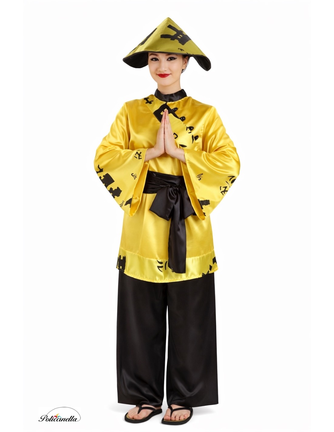 Eine von dem klassischen chinesischen Anzug inspirierte Kombination, bestehend aus einem Hemd aus weichem Satin im Tangzhuang-Stil, das den typischen diagonalen Verschluss und hohen Kragen nachahmt. Es wird mit Klettverschluss bequem am Nacken geschlossen. Der Rock, aus demselben Material gefertigt, verfügt über einen elastischen Bund und eine kleine Innentasche. Das Set wird mit dem traditionellen chinahut aus Schaumstoff vervollständigt, ausgestattet mit einem Innenband zur sicheren, bequemen Passform und um ein Herunterfallen zu vermeiden. Authentisch und voller orientalischem Charme!
