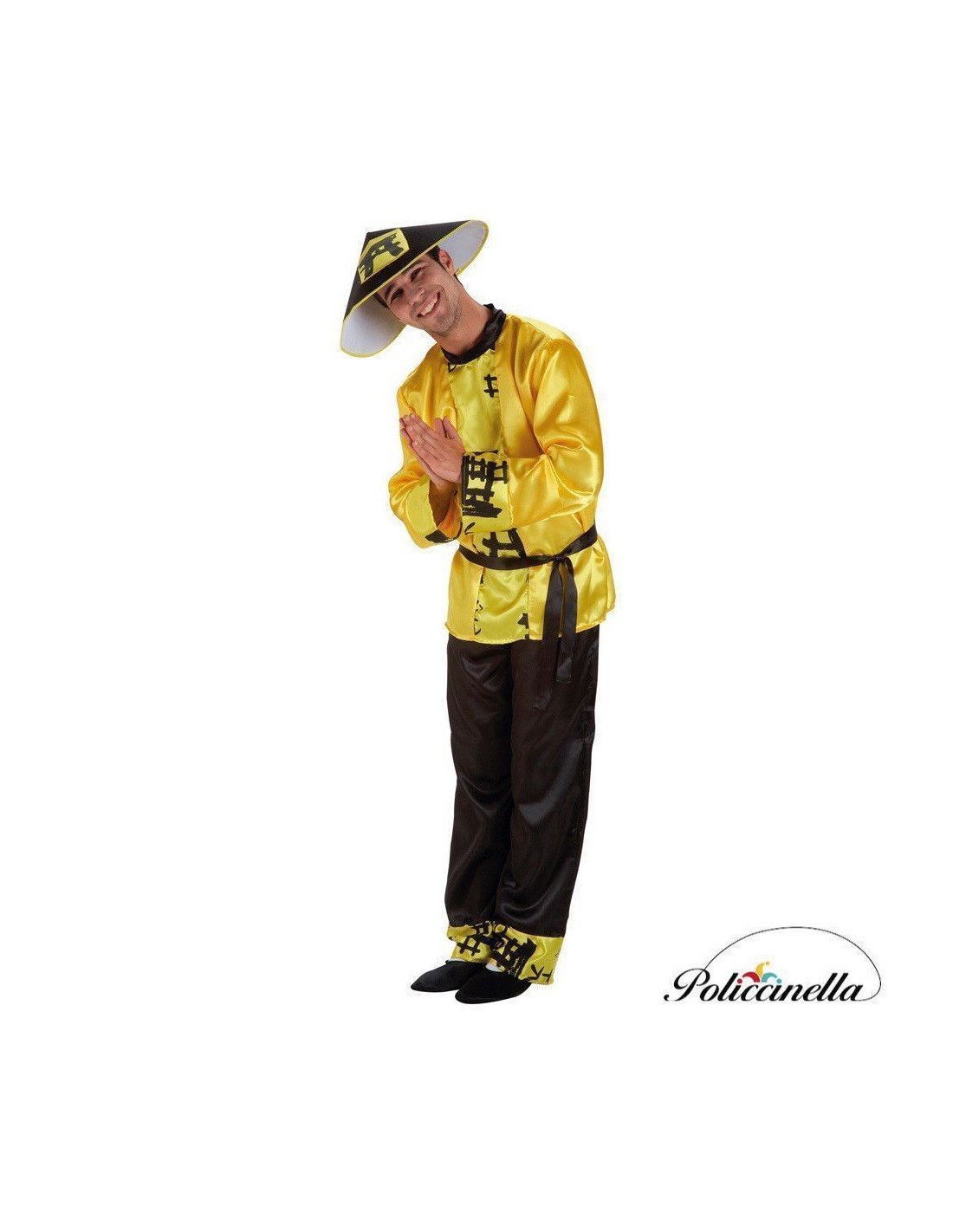 Ein Ensemble, inspiriert von dem klassischen chinesischen Anzug, bestehend aus einer Hemd aus weichem Satin mit einem Tangzhuang-Design, das den typischen diagonalen Verschluss und hohen Kragen imitiert. Es passt bequem mit Klettverschluss auf der Rückseite des Kragens. Die Hose, aus demselben Material gefertigt, verfügt über einen elastischen Bund und eine kleine Innentasche. Das Ensemble wird mit dem traditionellen chinesischen Hut vervollständigt, der formstabil ist und mit einem Innenband für einen festen und bequemen Sitz ausgestattet ist, um ein Herunterfallen zu verhindern. Authentisch und voller orientalischem Charme!