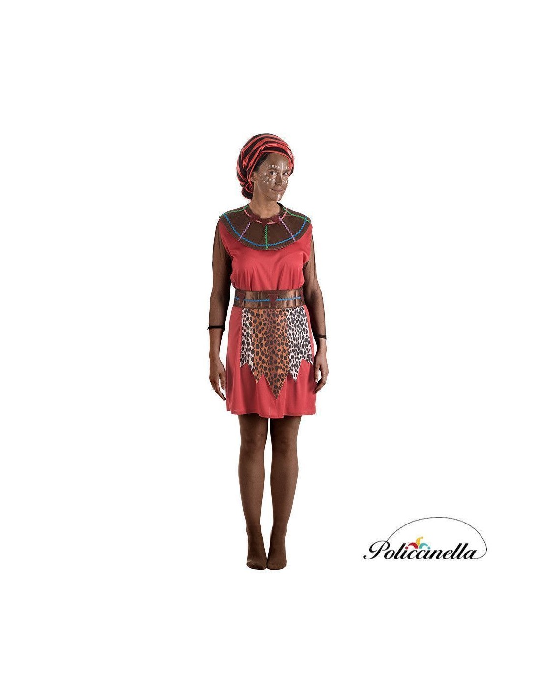 Elegantes Kleid aus weichem, halbelastischem Maschenstoff, mit Klettverschluss am Hals und halbtransparenten Gazeärmeln, die Leichtigkeit verleihen. Hervorzuheben ist der Kragen im Stammesstil, hergestellt aus schaumstoffbeschichtetem Polyester für mehr Volumen, verziert mit farbigen Wellen und aufgenähten Filzstücken, mit Klettverschluss hinten. Das Set wird durch einen passenden Gürtel komplettiert, von dem ein dekoratives Schürzentuch mit Leopardenmuster ausgeht. Ideal für kulturelle Aufführungen, schulische oder thematische Veranstaltungen. Authentisch und auffällig!