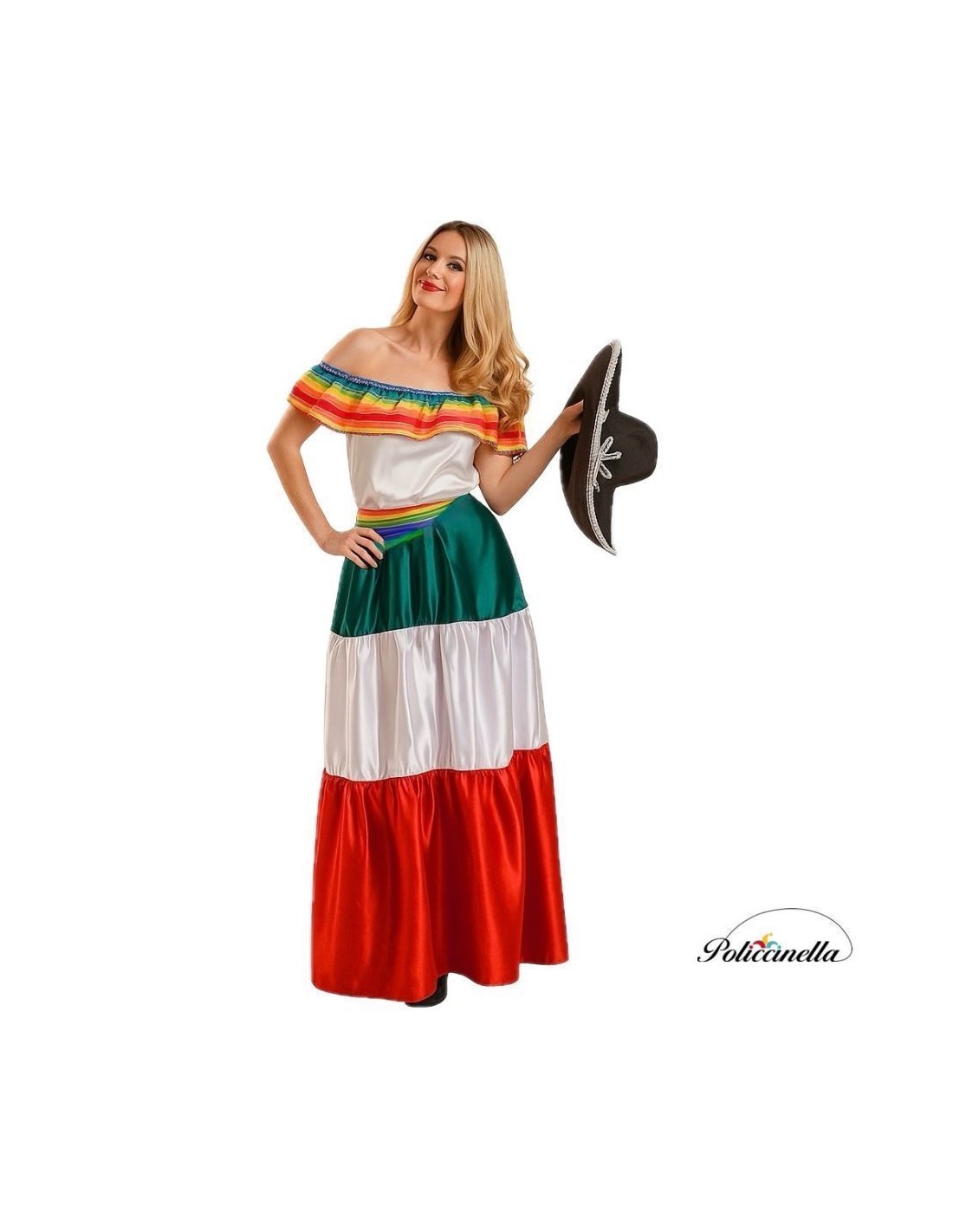 Hübsches Kleid aus dichtem und weichem Satin, mit einem Bootsausschnitt verziert mit einer auffälligen Rüsche und Gummizug für eine bequeme Passform. Die Ärmel sind mit grüner Paspel oder Wellenborte verziert und haben einen elastischen Bund für eine anpassungsfähige Passform am Arm. Der elastische Bund betont die Figur und verleiht dem Rock Volumen, was einen sehr fließenden Effekt erzeugt. Ein farbenfrohes dekoratives Stück an der Taille, das mit einer Schleife gebunden wird, ist inkludiert. Ideal für thematische Partys, Paraden und traditionelle Feierlichkeiten. Authentisch und voller Freude!