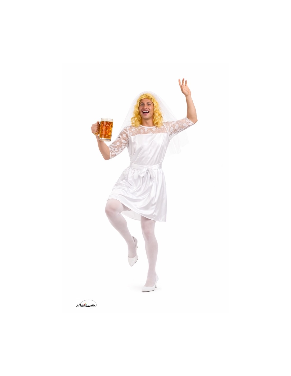 Dieses Brautkostüm, ideal für einen Junggesellenabschied, besteht aus einem weißen Kleid aus Satin mit Gummizug in der Taille, Spitze auf der Brust und Ärmeln bis zum Ellenbogen. Es wird mit einem Klettverschluss am Nacken auf der Rückseite angepasst.