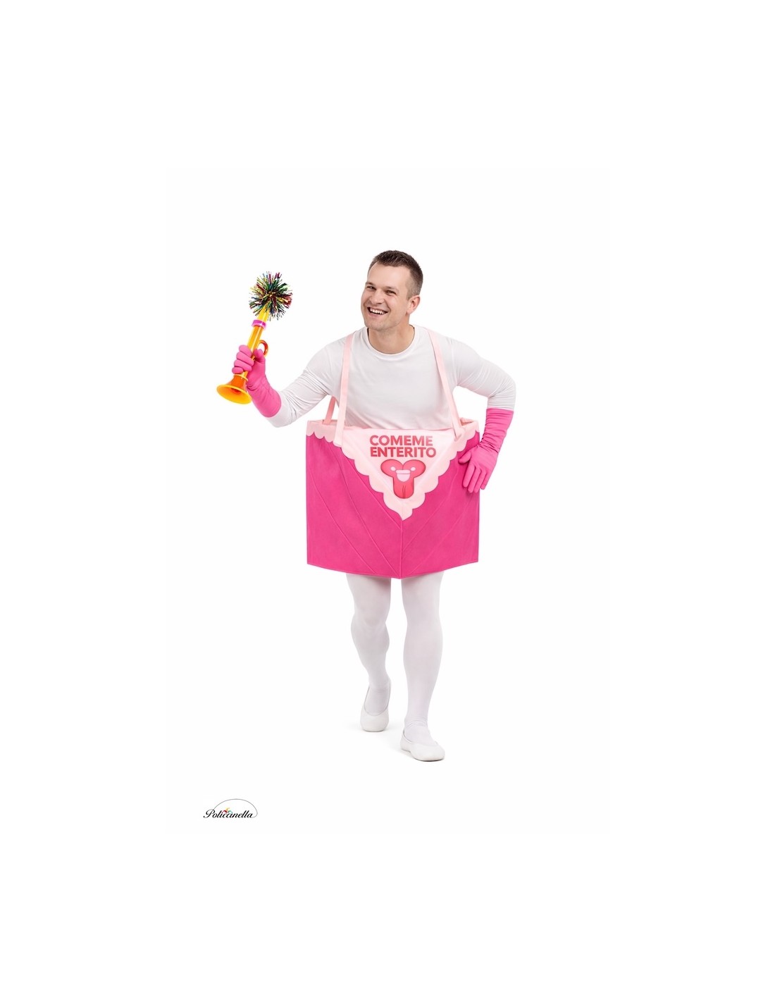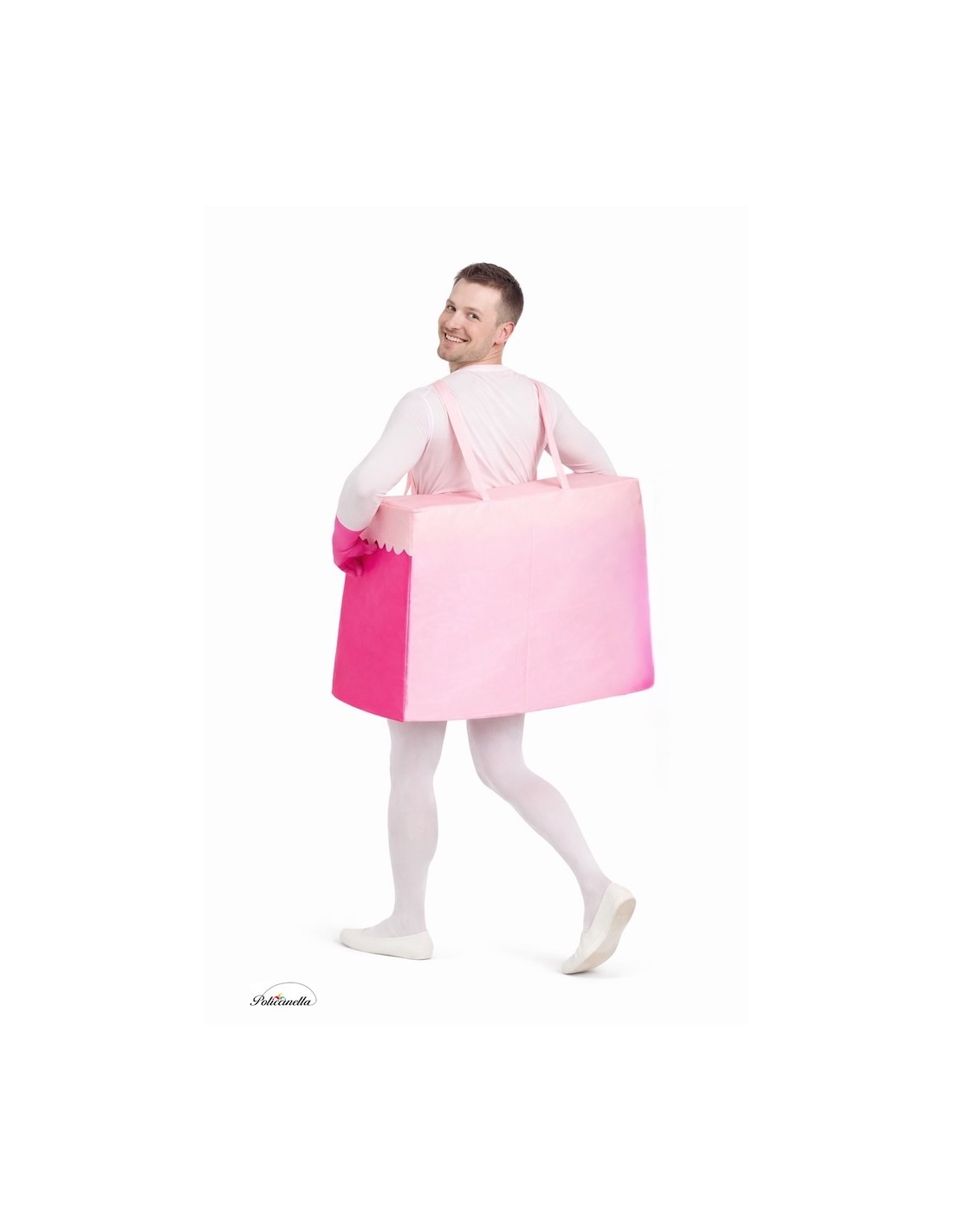 Ein lustiges und originelles Kostüm einer 3D-Tortenportion, hergestellt aus formstabilem Schaumstoff-Satin, das seine Form leicht und bequem beibehält. Es hat eine zentrale Öffnung, die mit weichem Maschenstoff verkleidet ist, durch die der Körper eingeführt wird, und verstellbare Frontträger auf der Rückseite mit Klettverschluss. Die Buchstaben und Zeichnungen sind auf dem Stoff gedruckt und mit kleinen flauschigen Pompons an der Vorderseite verziert, für einen festlichen und sympathischen Touch.