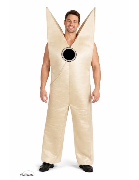 Ein originelles und lustiges Kostüm einer Klammer, ideal, um kreativ aufzufallen. Es beinhaltet einen einteiligen Satinanzug mit Schaumstoff, seitlichen Öffnungen für die Arme und unsichtbarem Frontreißverschluss. Vorne und hinten ist ein Motiv aus Schaumstoff, durch eine Nylonkordel verbunden, die das klassische Zahnrad der Klammer simuliert. Ein einfallsreiches und auffälliges Design, um auf keiner Party unbemerkt zu bleiben.