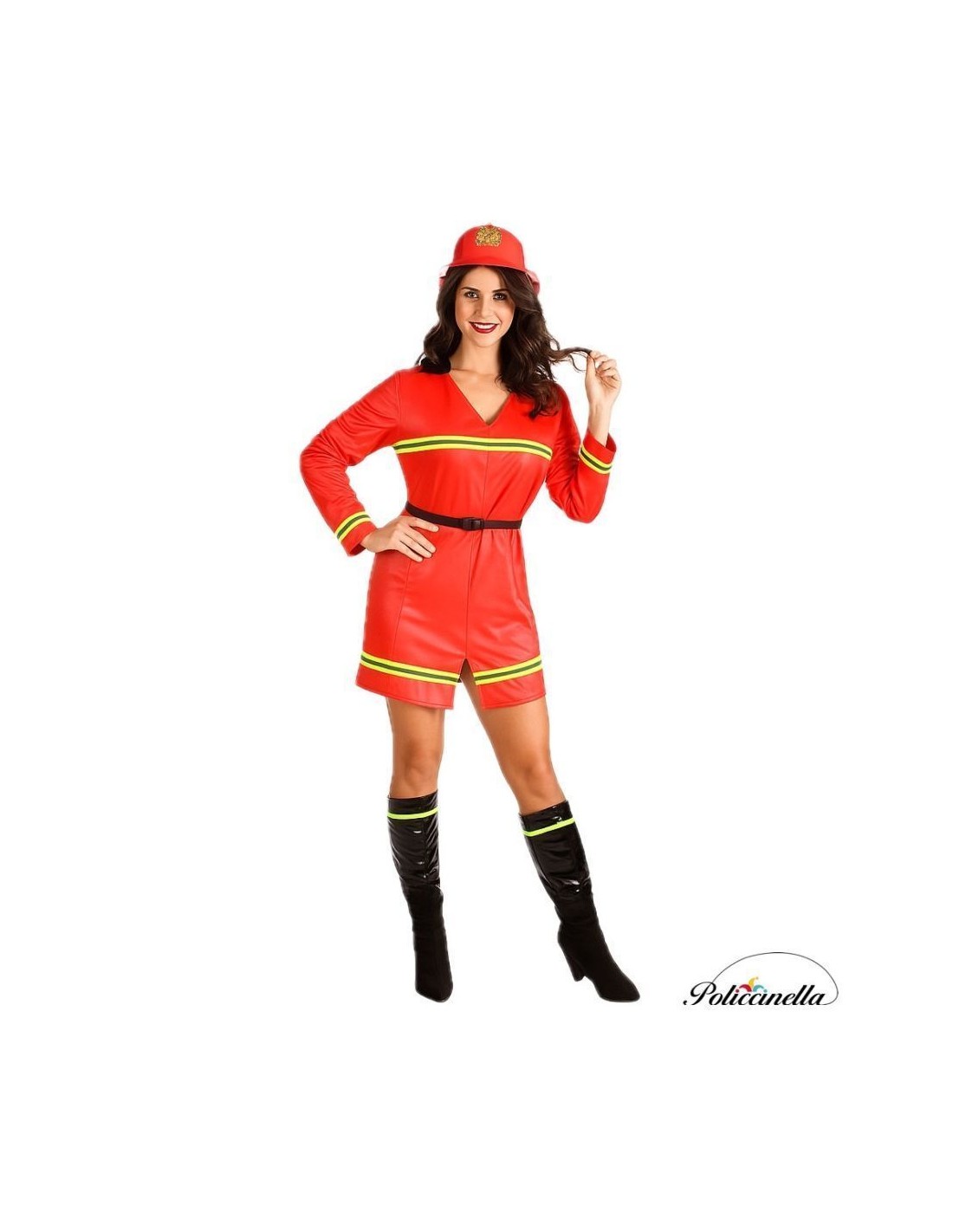 Ein tolles und vollständiges Feuerwehrkostüm von hoher Qualität, bestehend aus einem Kleid aus halbelastischem Strickstoff mit einer Lederoptik und einem lackähnlichen Kragen. Es verfügt über reflektierende Bänder (nicht fluoreszierend) auf der Brust, den Ärmeln und am Saum. Enthalten sind auch Stiefelstulpen aus lackähnlichem Material, verziert mit denselben Bändern, um ein harmonisches Ensemble zu schaffen. Abgerundet wird das Kostüm mit einem optionalen Nylon-Gürtel mit Schnalle zur Taillenregulierung.