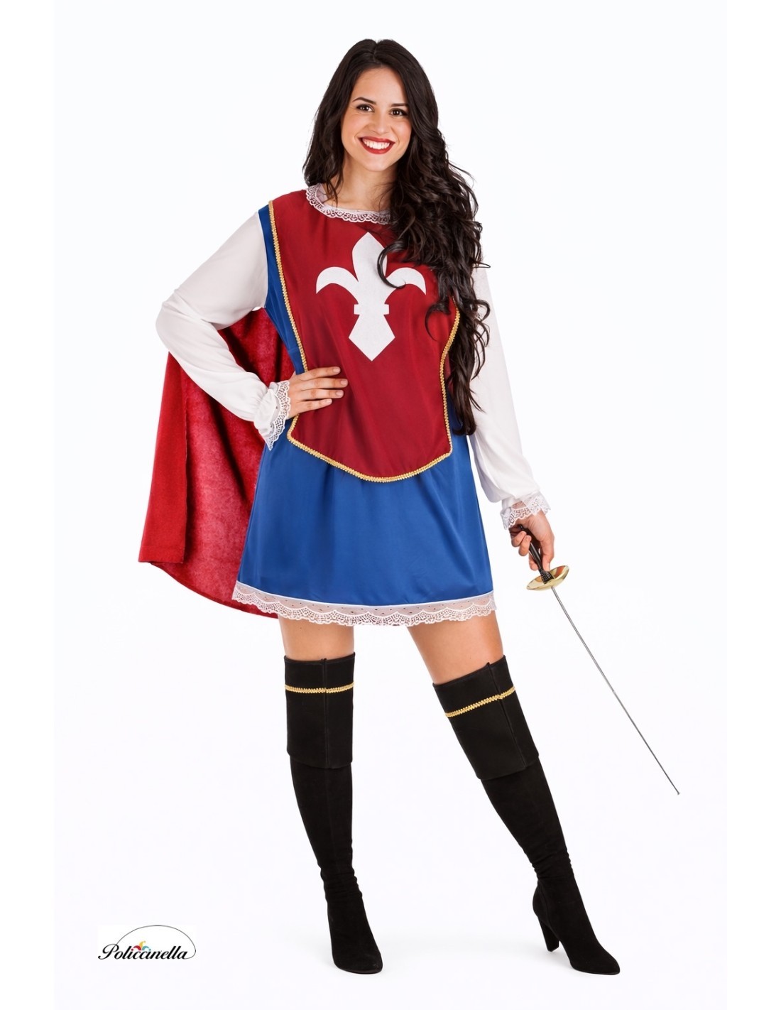 Elegantes Musketier-Kostüm, das Stil und Komfort vereint. Das Kleid aus weichem, halbelastischem Stoff hat eine vordere Wein-farbene Partie mit einem pfirsichartigen Griff, die eine Rüstung mit Schild simuliert, die an den Schultern befestigt ist und durch eine hintere Schleife verstellbar ist. Kragen und Ärmel sind mit Borte und Spitze verziert und enden in Bündchen mit Gummizug für eine perfekte Passform. Von den Schultern fällt ein samtiger Wein-farbener Umhang, der mit Klettverschluss für mehr Komfort befestigt ist. Das Set wird mit stiefelähnlichen Schaftstiefeln vervollständigt, die mit feiner Borte verziert sind und einen edlen und distinguierten Touch verleihen, der jeder Musketierin würdig ist.