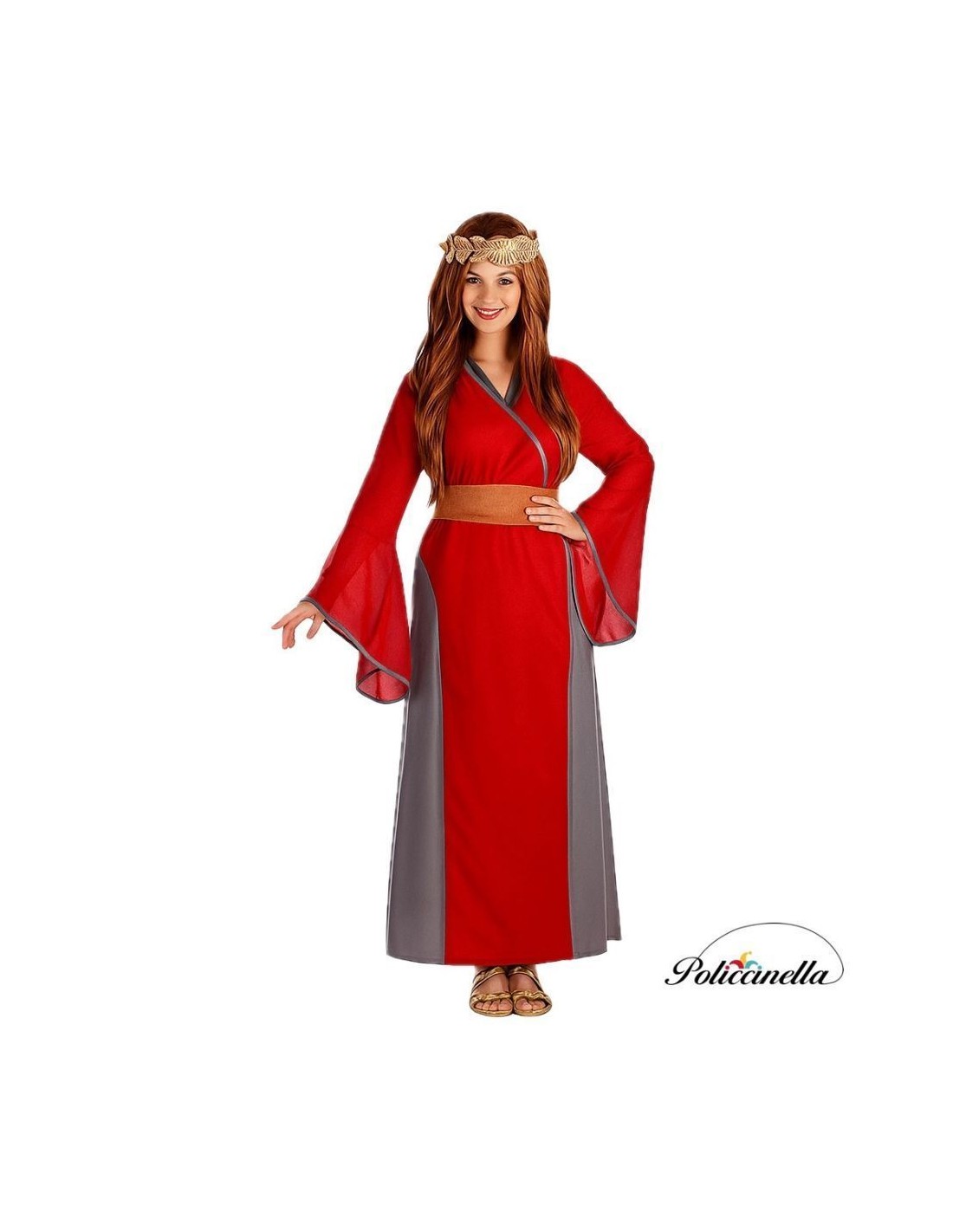 Tunika mit weichem Pfirsichhaut-Touch und mit Klettverschluss am Nacken auf der Rückseite. Verziert mit grauen Borten, die zum Hals und einem Teil des Kleides passen. Ergänzt wird das Outfit durch einen Gürtel aus dem gleichen Stoff wie die Tunika, umhüllt von einem goldenen Netz. Der Gürtel wird auf der Rückseite mit einer Schleife befestigt.