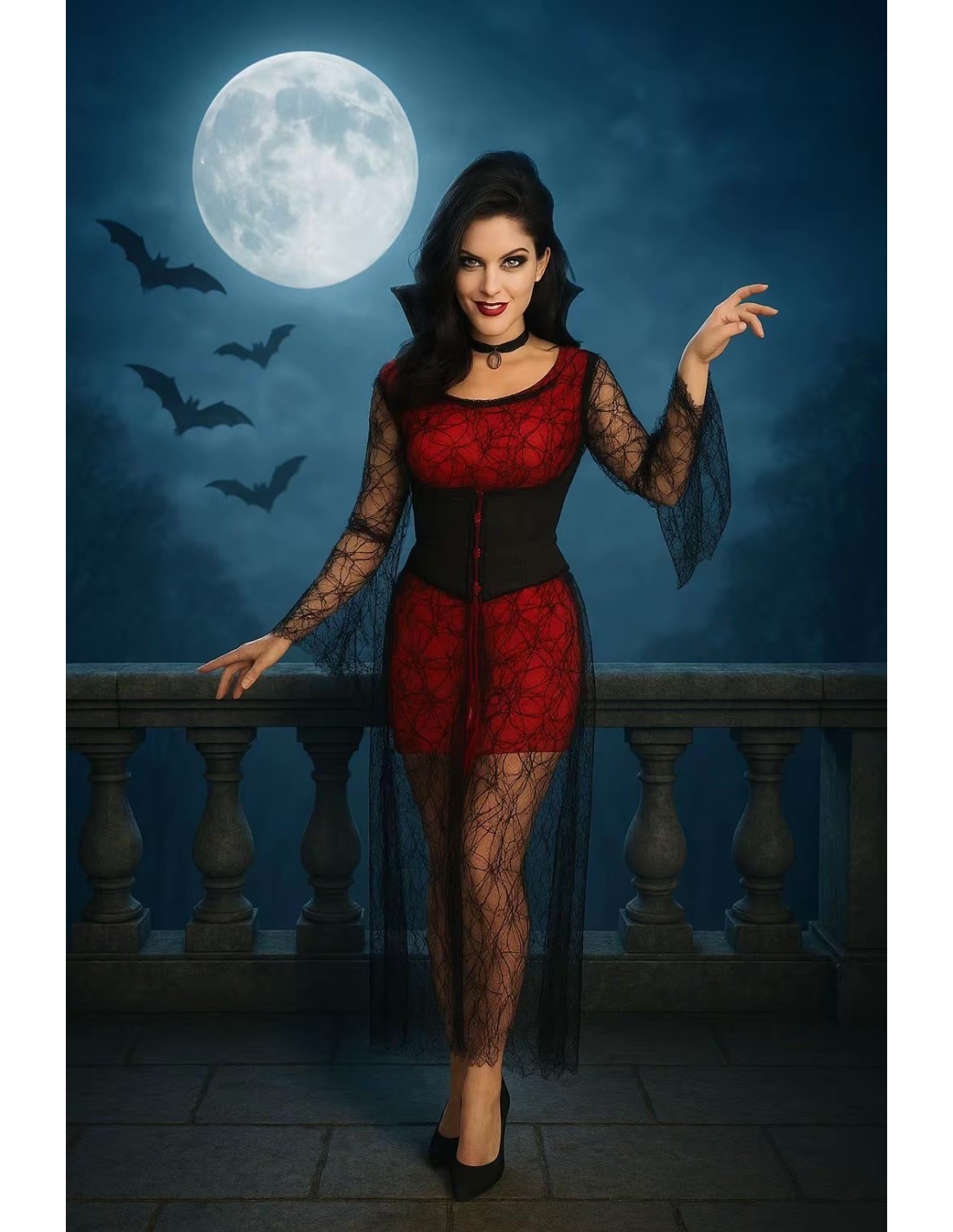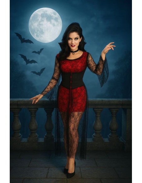 Ein elegantes und geheimnisvolles Design, um an Halloween zu glänzen. Das gerade geschnittene Kleid ist aus weichem halbelastischem Maschinenstrick gefertigt und mit einer zarten Spitzenborte bedeckt, die mit einem Spinnennetzmuster verziert ist, das Textur und Fantasie verleiht. Der strukturierte und leicht aufgepolsterte hohe Kragen behält seine Form bei und verleiht dem Ensemble Präsenz. Das Kleid wird durch ein Mieder ergänzt, das aus demselben Stoff gefertigt ist und mit Schaumstoff verstärkt wurde, um die Silhouette zu definieren. Es wird hinten mit einer Schleife und vorne mit einem sich kreuzenden Zickzack-System angepasst, inspiriert von klassischen gotischen Outfits.