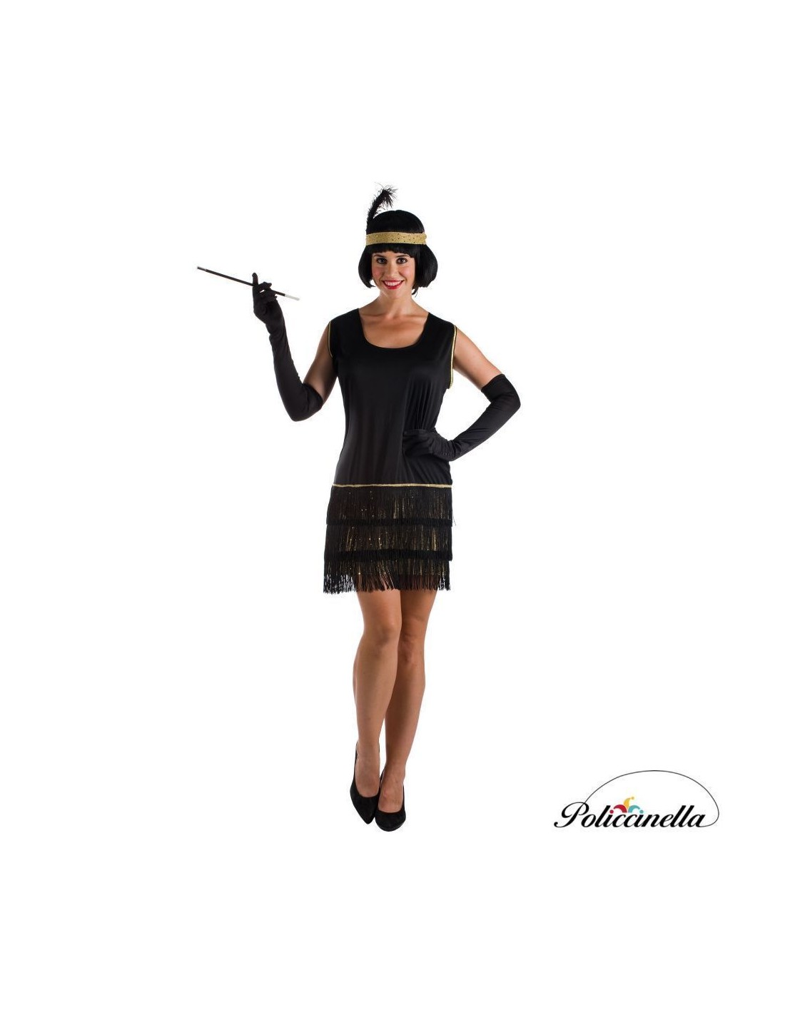 Dieses bezaubernde Charleston-Kleid ruft den ganzen Glamour der 20er Jahre mit einem bequemen und raffinierten Design hervor. Hergestellt aus weichem halbelastischem Maschenstoff, hat es einen klassischen Schnitt, der mit goldenen Verzierungen an den Schultern und einem eleganten dekorativen Streifen auf Hüfthöhe verziert ist. Der Saum des Kleides ist aus goldenem Stoff mit aufgenähten Pailletten gefertigt und wird durch drei Reihen glänzender Fransen betont, die Bewegung und Rhythmus beim Gehen verleihen. Enthalten ist ein elastisches Kopfband, hergestellt aus goldenem Stoff mit Pailletten und verziert mit einer ikonischen Feder vorne, um den Look zu vervollständigen.