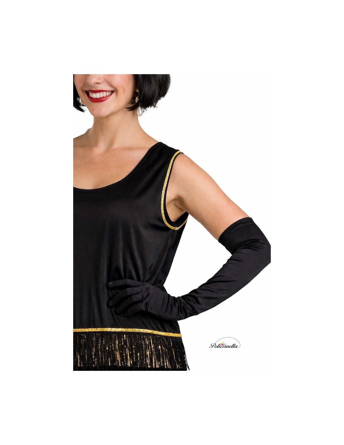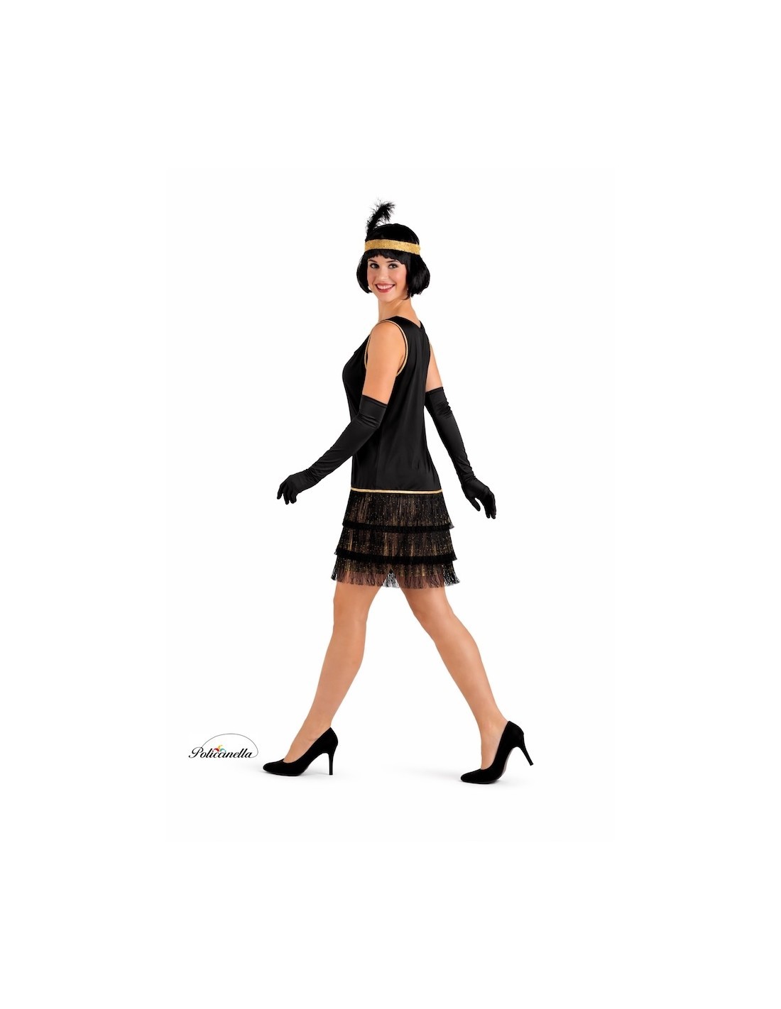Dieses bezaubernde Charleston-Kleid ruft den gesamten Glamour der 20er Jahre mit einem bequemen und raffinierten Design hervor. Hergestellt aus weichem, halbelastischem Maschenstoff, präsentiert es einen klassischen Schnitt, verziert mit goldenen Verzierungen an den Schultern und einem eleganten dekorativen Band auf Hüfthöhe. Der Saum des Kleides ist aus goldenem Stoff mit aufgenähten Pailletten gefertigt, betont durch drei Reihen glänzender Fransen, die Bewegung und Rhythmus beim Gehen verleihen. Es beinhaltet ein elastisches Stirnband, hergestellt aus goldenem Stoff mit Pailletten und abgeschlossen mit einer ikonischen Feder vorne, um den Look zu vervollständigen.