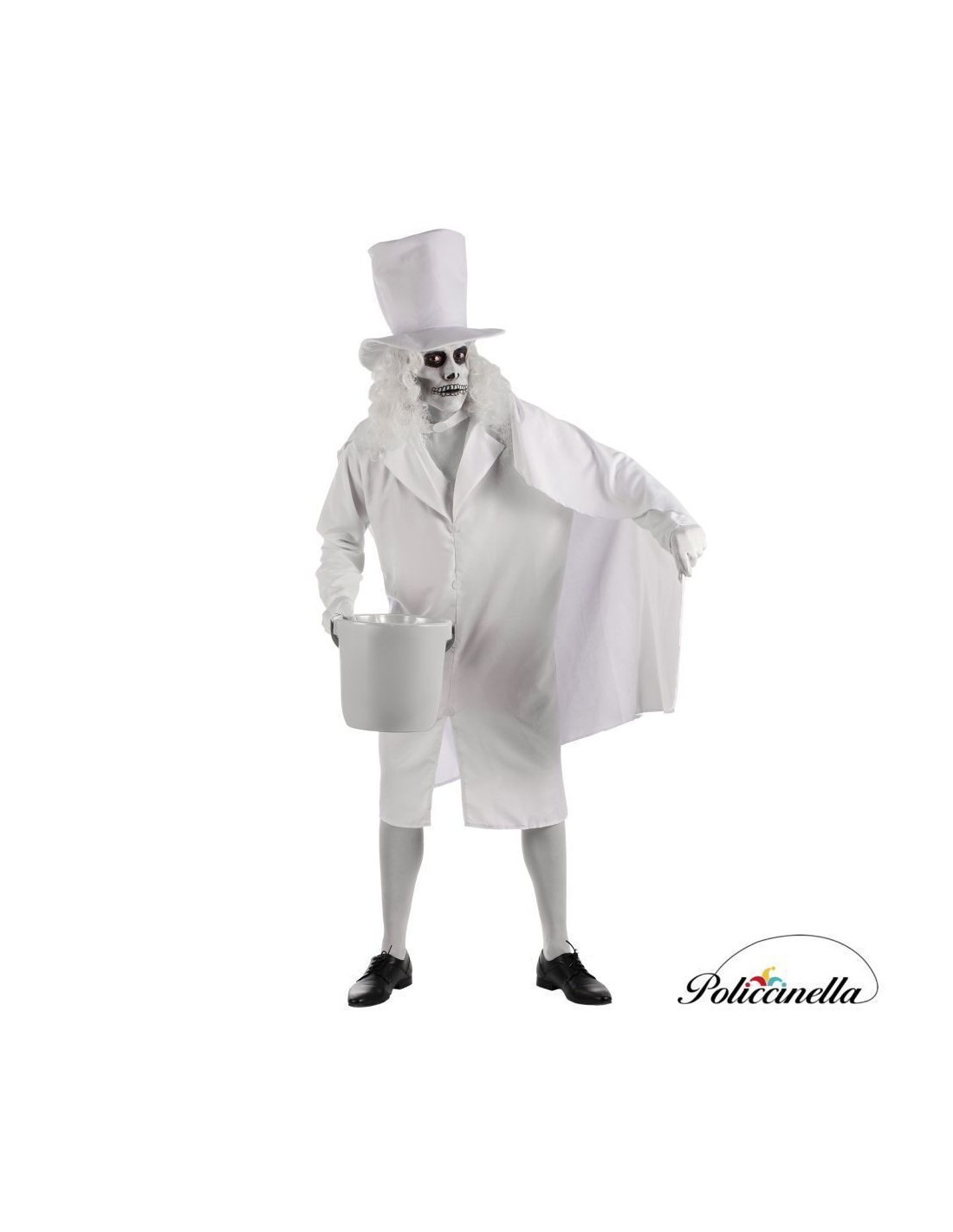 Ein gespenstisches Design mit einer distinguierten Note. Dieses Kostüm beinhaltet einen hohen Zylinderhut, gefertigt aus einem samtig-weichen Stoff auf einer Basis aus steifem Filz, der seine makellose Form behält. Die gerade geschnittene und lange Jacke ist aus dichtem und weichem Polyester gefertigt, das NICHT durchsichtig ist, und verfügt über einen strukturierten Kragen mit Schaumstoff, große Revers und dekorative Knöpfe (nicht funktional) an der Vorderseite, die aus Filz gefertigt und am Kleidungsstück befestigt sind. Der passende Umhang, ebenfalls aus hochdichtem Polyester, wird mit einem vorderen Filzstück am Kragen befestigt und vervollständigt ein elegantes, bequemes und mysteriöses Ensemble.