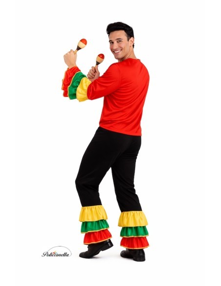Blenden Sie mit Rhythmus und Farbe mit diesem fröhlichen Rumba-Kostüm für Erwachsene. Es beinhaltet ein leichtes und bequemes Halbelastik-Shirt aus Maschenware, das mit bunten Rüschen aus schillerndem Mehrfarben-Satin an den Ärmeln verziert ist und mit goldenen Bändern abgerundet wird. Die passende Hose mit elastischem Bund und kleiner Innentasche wiederholt die gleiche Verzierung an den Beinen und schafft so ein harmonisches und auffälliges Outfit. Ideal für Paraden, Auftritte, Themenpartys oder jede Feier, die Bewegung, Energie und tropischen Stil erfordert.