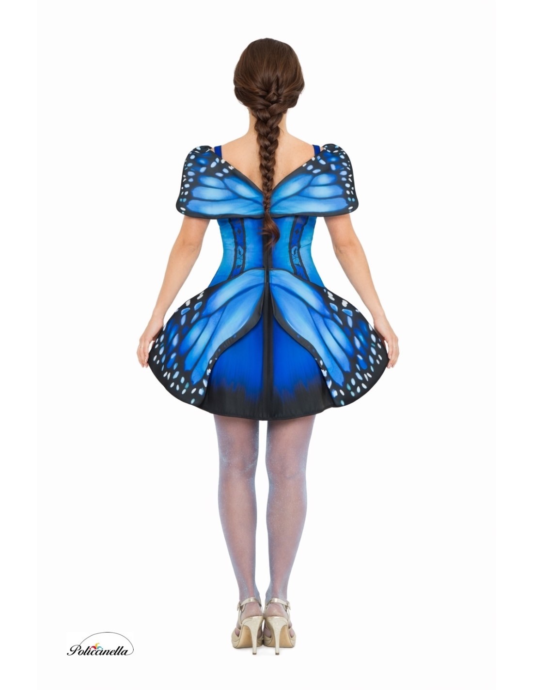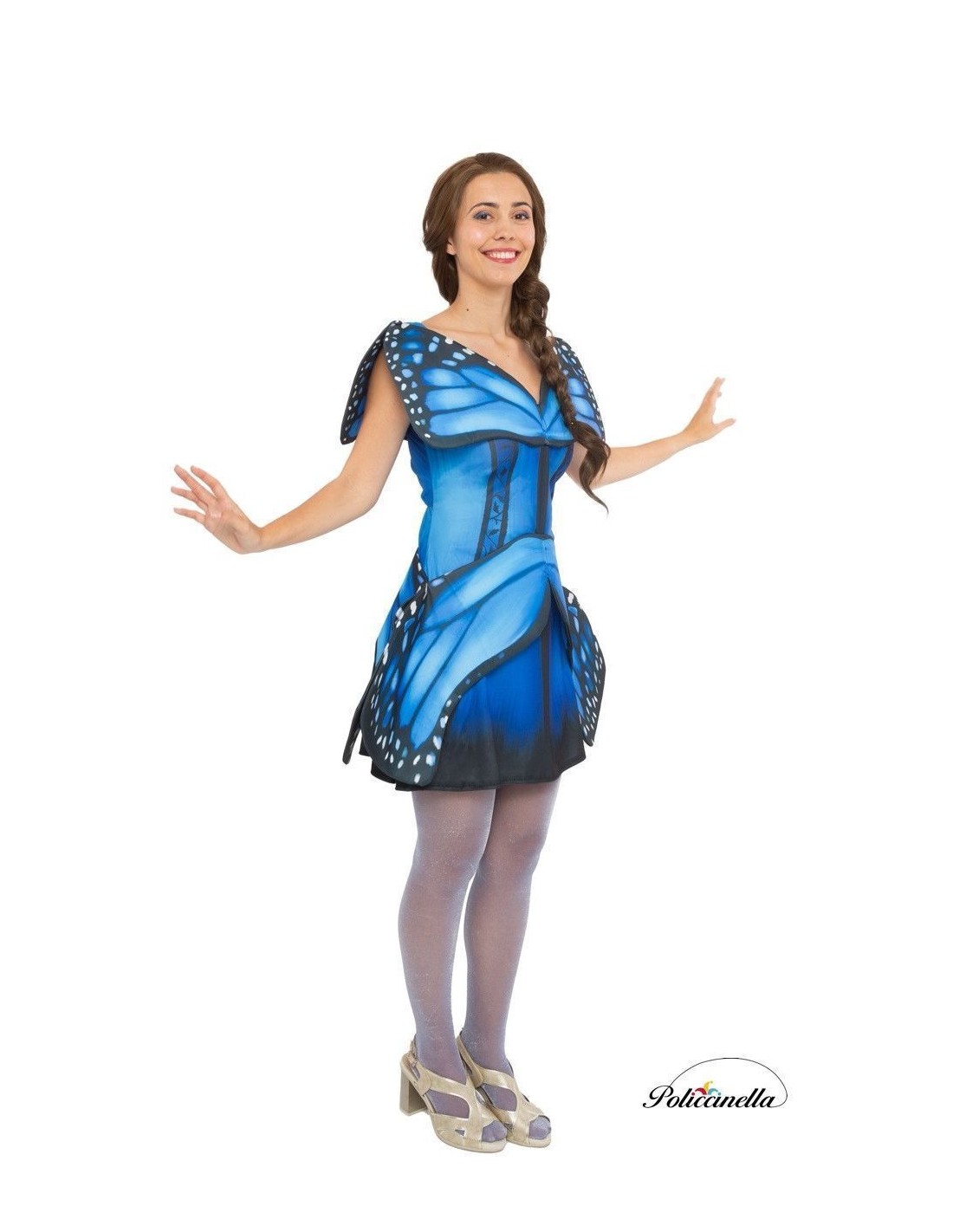 Dieses Kostüm, aus maschinengestricktem Stoff mit digital bedrucktem Muster in verschiedenen Blautönen, hat an Schulterhöhe und an der Hüfte Schmetterlingsflügel. Diese Flügel bestehen aus einem Filzstück, das mit dem gleichen Stoff wie das Kleid überzogen ist, um dem Kleidungsstück Steifheit zu verleihen, ohne seine Elastizität zu beeinträchtigen, wodurch die Struktur und Form erhalten bleiben.