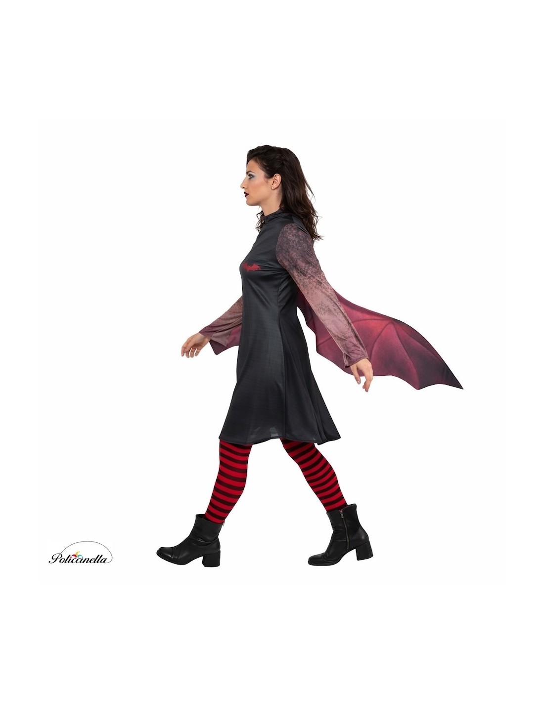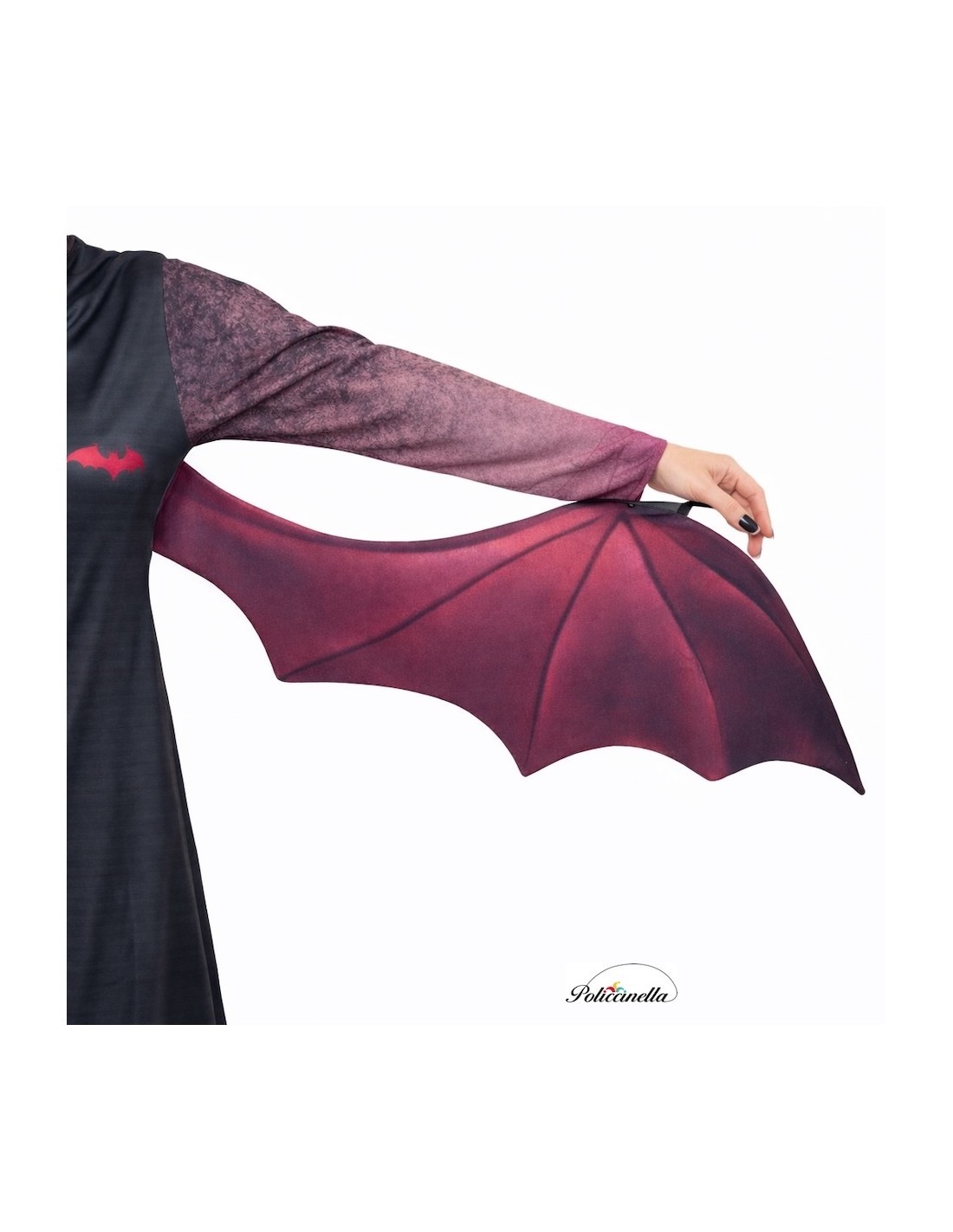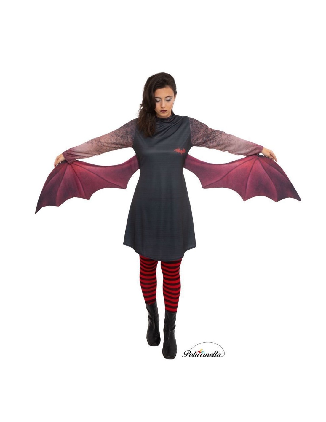 Dieses coole Kostüm, aus maschinengestricktem Material mit digital gedrucktem Muster gefertigt, verfügt über einen unsichtbaren Reißverschluss auf der Rückseite und attraktive Flügel, die aus demselben Material wie das Kleid gefertigt sind und auf Taillenhöhe angebracht sind. Die Flügel bestehen aus einem Filzstück, das mit demselben Stoff wie das Kleid überzogen ist, um dem Kleidungsstück Steifheit zu verleihen, aber gleichzeitig Elastizität zu ermöglichen, um Bewegungsfreiheit zu gewährleisten. Außerdem haben sie ein Armband, um die Hand einzuführen und sie um das Handgelenk zu halten, um die Bewegung der Arme zu begleiten, ohne sie festhalten oder greifen zu müssen, und sie wiegen überhaupt nichts! Dieses Kostüm wird durch blickdichte und elastische Strumpfhosen vervollständigt, die passend zum Rest des Kostüms sind.