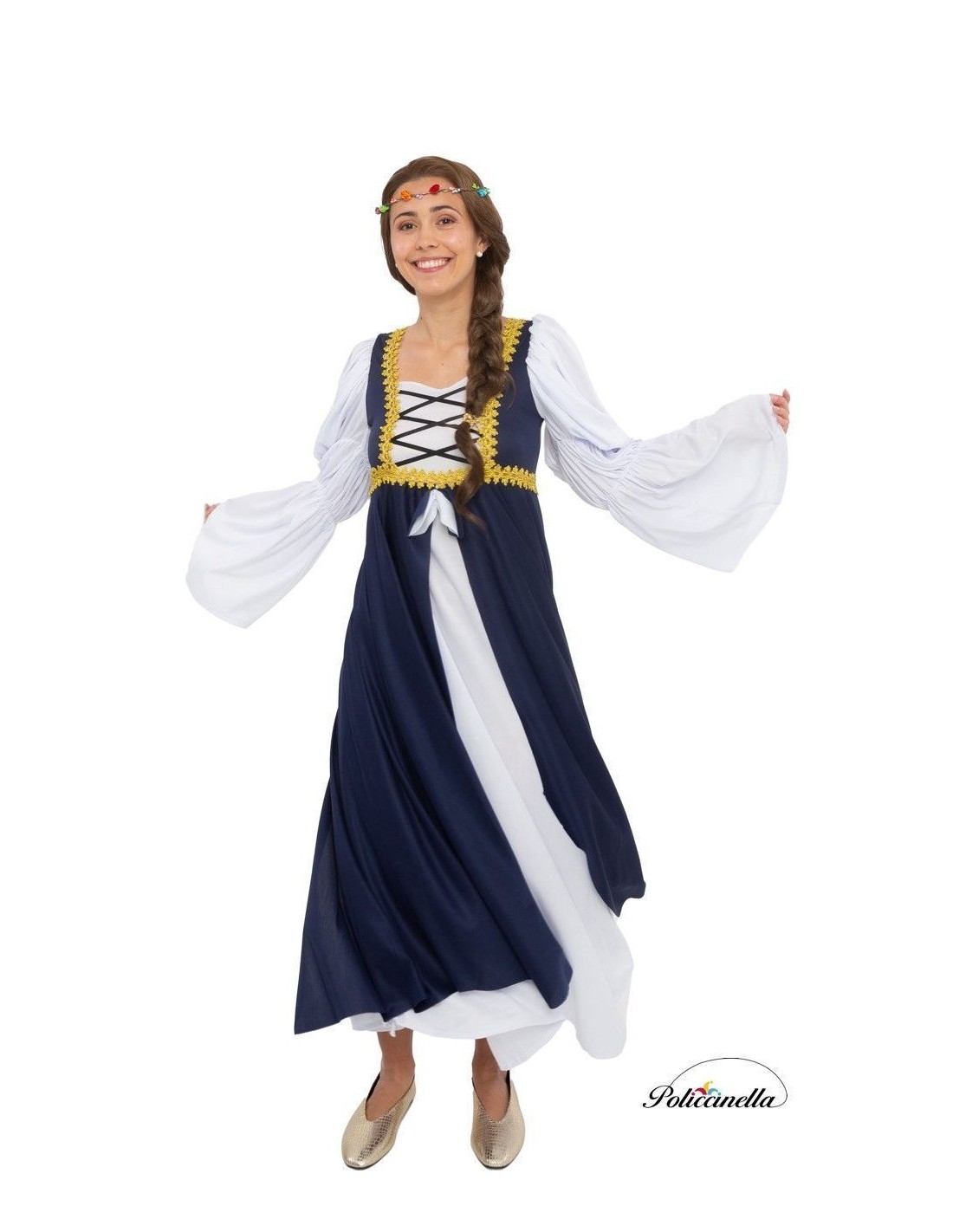 Dieses elegante mittelalterliche Kostüm für Frauen zeichnet sich durch die Qualität seiner Verarbeitung und die Schönheit seines Designs aus. Der Körper, gefertigt aus weichem halbelastischem Strick, passt sich bequem an die Figur an und ist reich verziert mit goldenen Bändern und Borten, die dem Ganzen einen edlen und vornehmen Touch verleihen. Von ihm aus geht ein zweischichtiger Rock mit einem schönen Schwung ab, der Bewegung und Aufmerksamkeit auf das Gesamtbild lenkt. Die Taille ist mit zarten Blüten verziert, die die Silhouette schlanker wirken lassen und einen originellen Touch hinzufügen. Die langen, gerafften Ärmel haben an den Ellbogen Gummizug für eine elegante und bequeme Passform. Der Verschluss des Kleides befindet sich diskret auf der Rückseite mit einem unsichtbaren Reißverschluss, der ein makelloses Finish gewährleistet. Ein Kostüm von hoher Qualität, ideal für Darstellungen und Themenpartys im mittelalterlichen Stil.