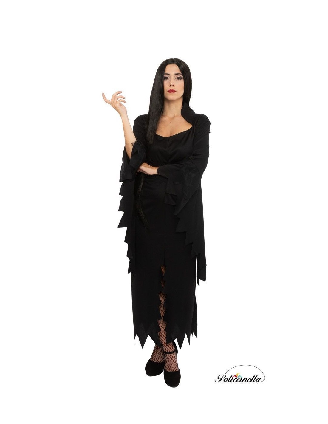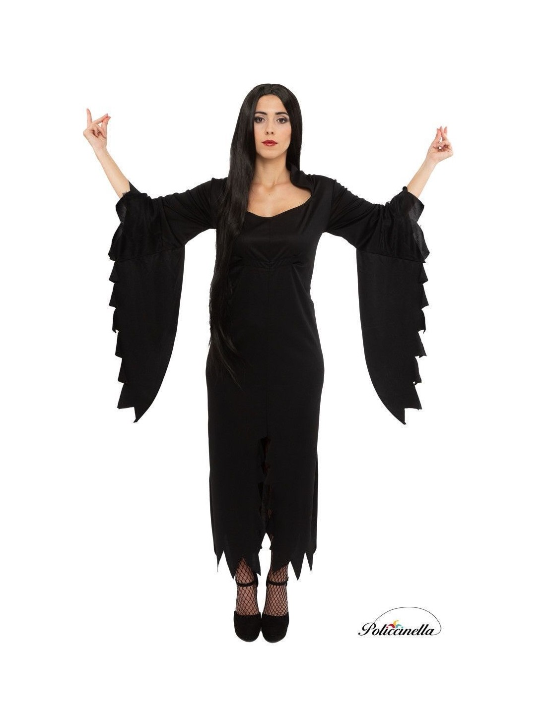 Dieses Kleid, das aus halbelastischem Maschenstoff gefertigt ist, hat einen halbherzförmigen Ausschnitt mit Kragenklappe und einer vorderen Öffnung bis zum Knie. Die halblangen Ärmel haben einen Überärmel, der fast bis zu den Knöcheln reicht. Das Kleid hat eine Naht unter der Brust, um die Figur zu betonen, und wird mit einem Gürtel geliefert, der sich mit einem Klettverschluss an die Taille anpasst.