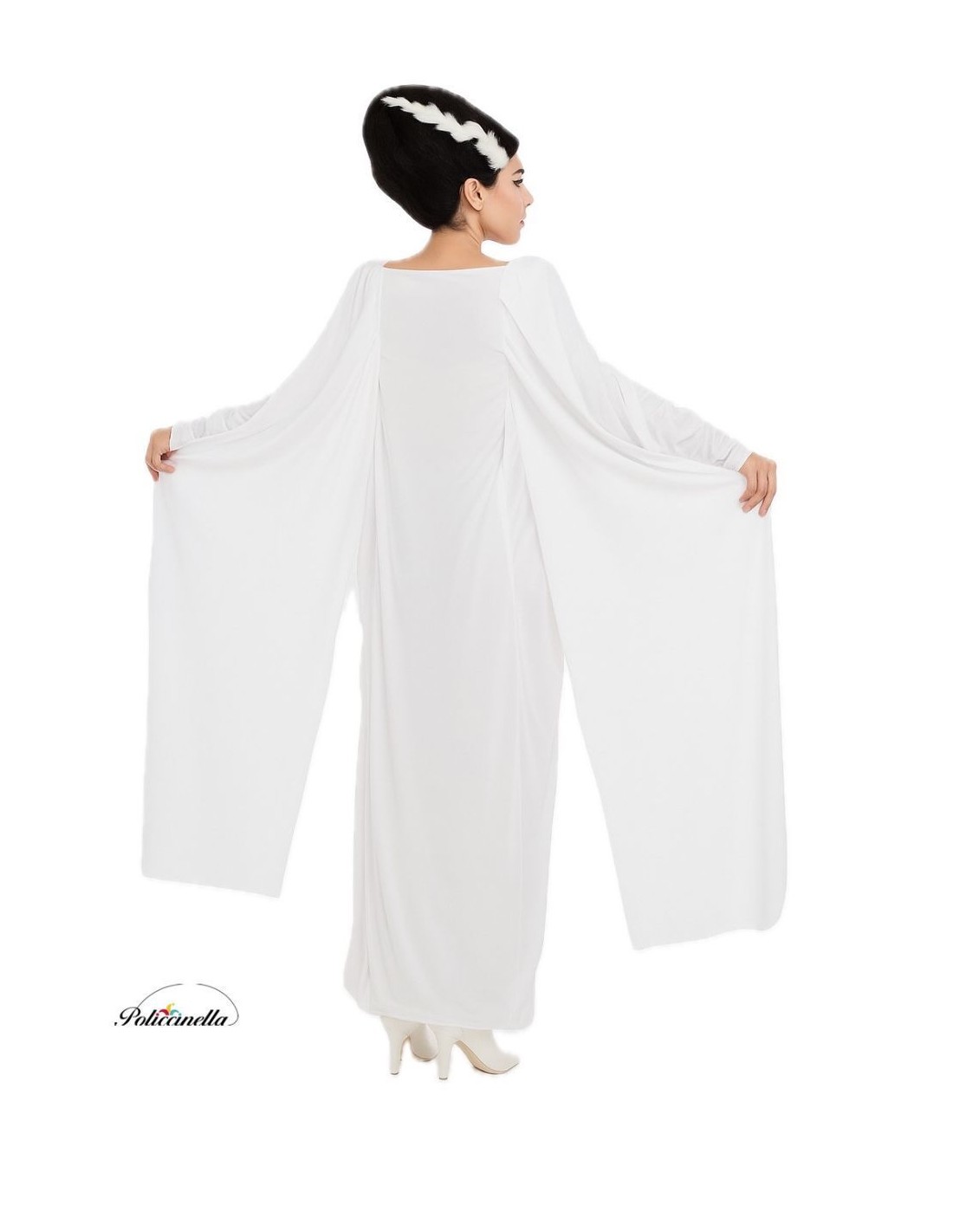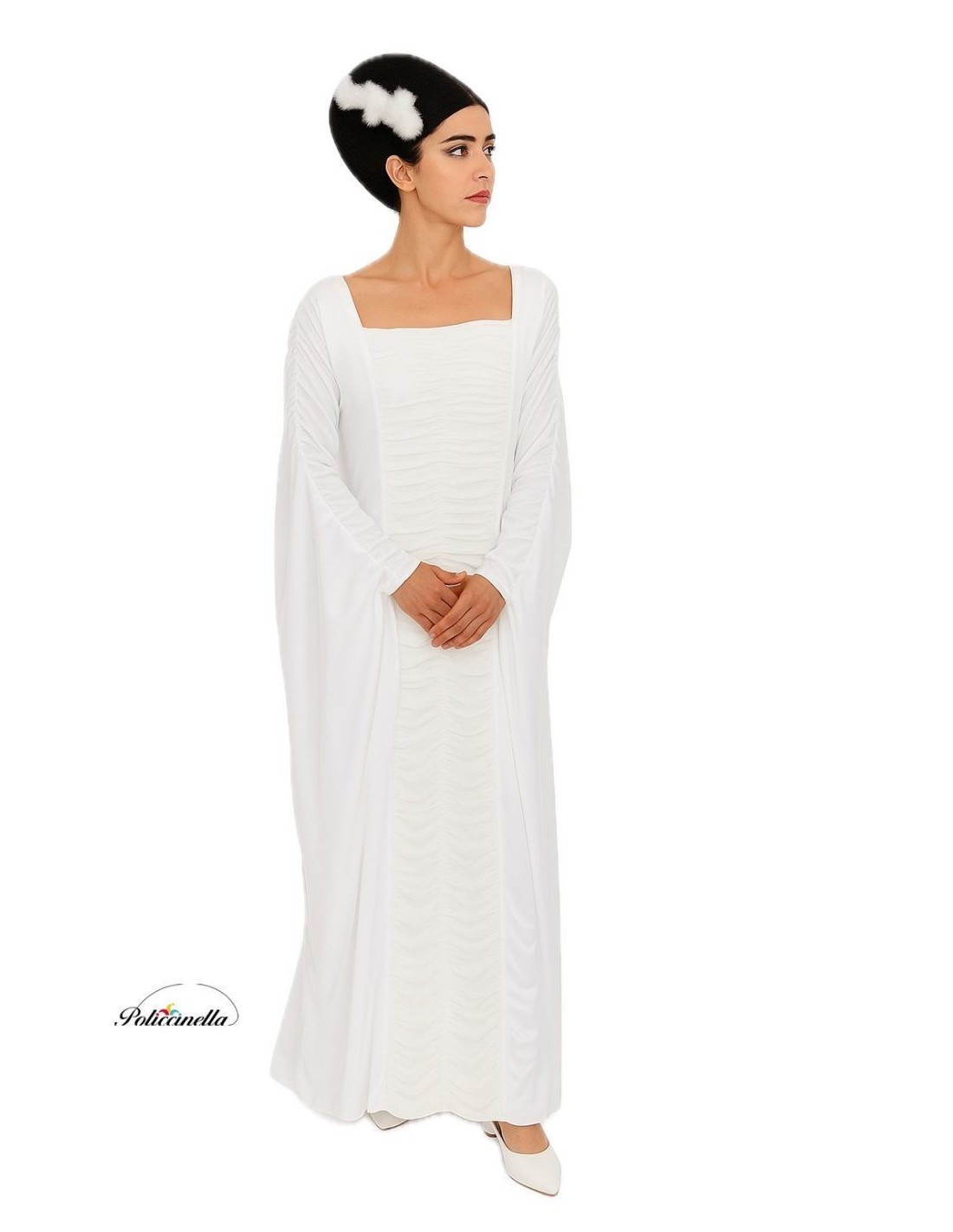 Elegantes und spektakuläres Kostüm der Braut von Frank, bestehend aus einem langen Kleid mit großem Fall, hergestellt aus weichem Maschenstoff. Es präsentiert eine zarte Raffung in der Mitte und an den Ärmeln, mit einem Kastenkragen und geradem Schnitt, der die Figur schmeichelt. Der Rock hat einen sanften Schwung, während das hintere Gummi von Achsel zu Achsel große Anpassungsfähigkeit bietet, passend für Größen von 36 bis 44. Auf der Rückseite zeichnen sich die beeindruckenden Umhang-Ärmel aus, die von den Schultern bis zum Boden reichen und eine zeremonielle und einzigartige Note verleihen. Darüber hinaus enthält es eine verstellbare Perückenhaube!!!, ein zusätzliches Detail, das die Verkleidung perfektioniert.