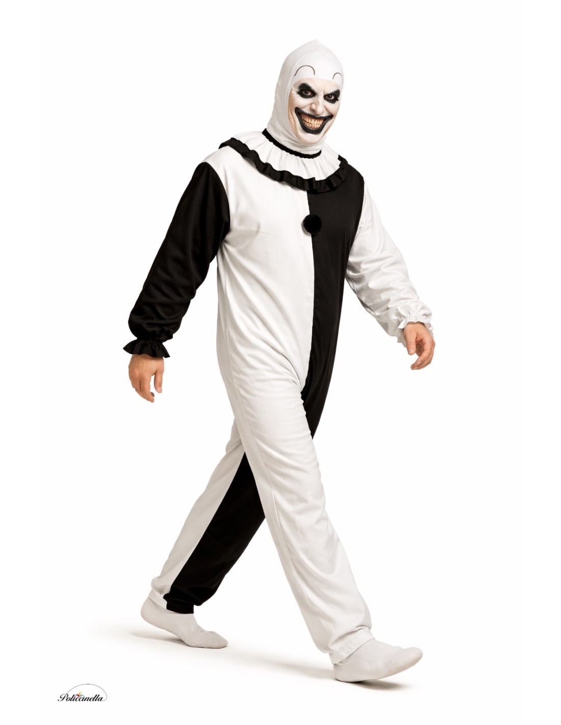 Kostüm eines idealen Killer-Clowns für ein wirklich schauriges Halloween. Enthält zweifarbigen Overall in Schwarz und Weiß und eine Sturmhaube aus hochwertigem, weichem Flanellstoff. Der Overall wird mit einem unsichtbaren Reißverschluss auf der Rückseite geschlossen und die Sturmhaube hat weiß-schwarze Rüschen am Kragen mit Klettverschluss. Enthält auch eine kleine Filzhut-Chistera zum Anstecken (Nadel nicht enthalten). Ein düsteres, bequemes und sehr eindrucksvolles Aussehen.