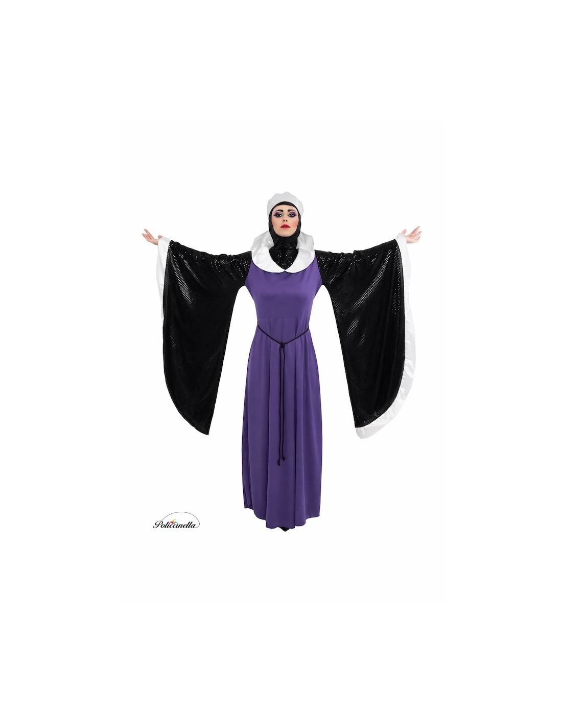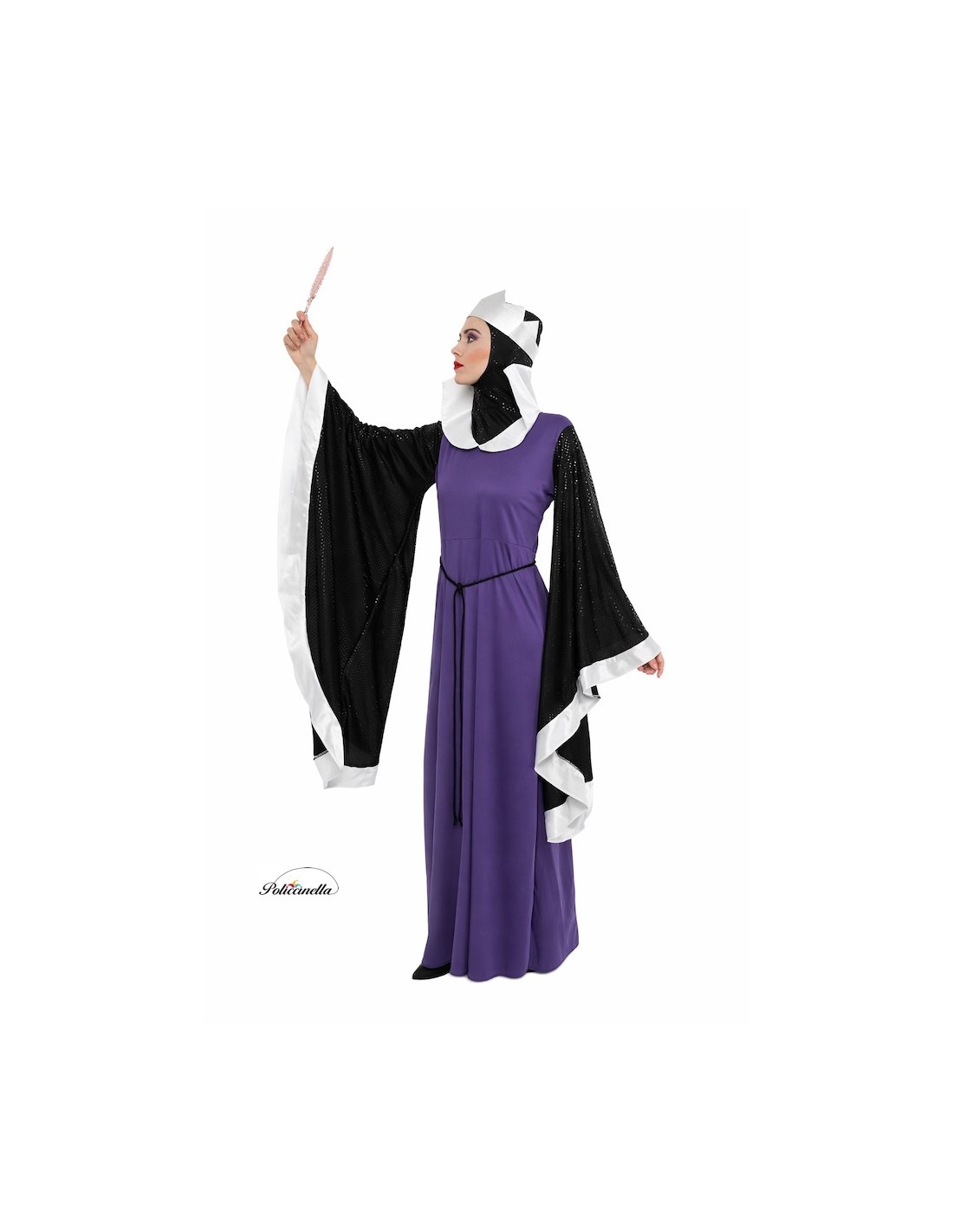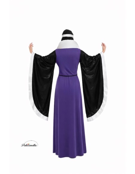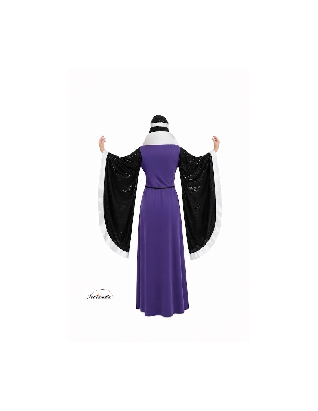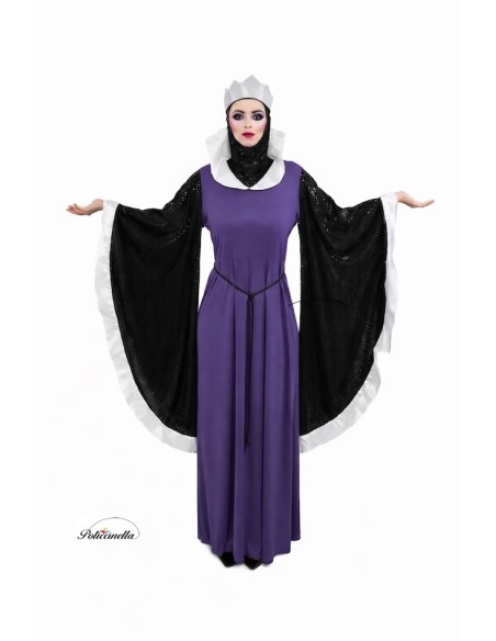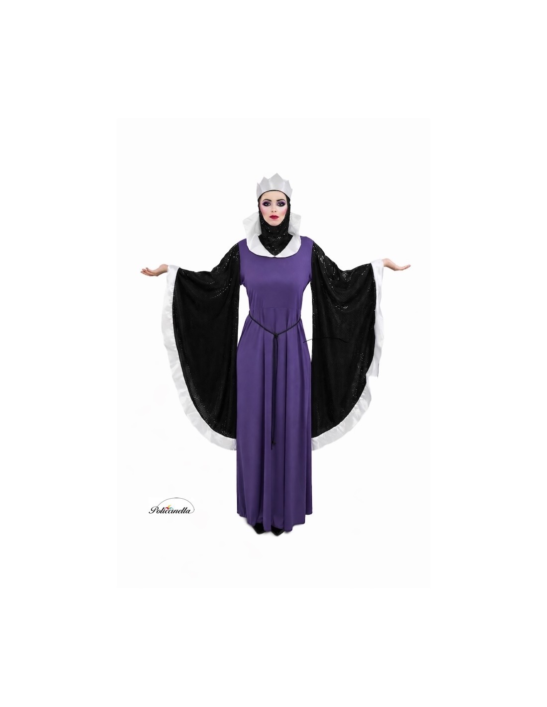 Imposant und anspruchsvoll, dieses Kostüm ist aus halbelastischem Maschenstoff gefertigt, mit Gummiband in der Taille und einem tiefen Ausschnitt mit halbstarrem Revers. Die weiten Ärmel, fast bis zum Boden reichend, zeichnen sich durch das Gewebe mit eingebetteten Pailletten aus, genauso wie die passende Sturmhaube, die mit Gummibändern für sicheren Halt entworfen wurde. Enthalten sind eine silberne Schaumstoffkrone, eine verstellbare Schleife in der Taille und dekorativer schwarzer Schnur. Die anpassbare Verarbeitung ermöglicht eine bequeme Passform in Größen von 38 bis 44 und bietet Eleganz, Komfort und Bühnenpräsenz in jedem Detail.