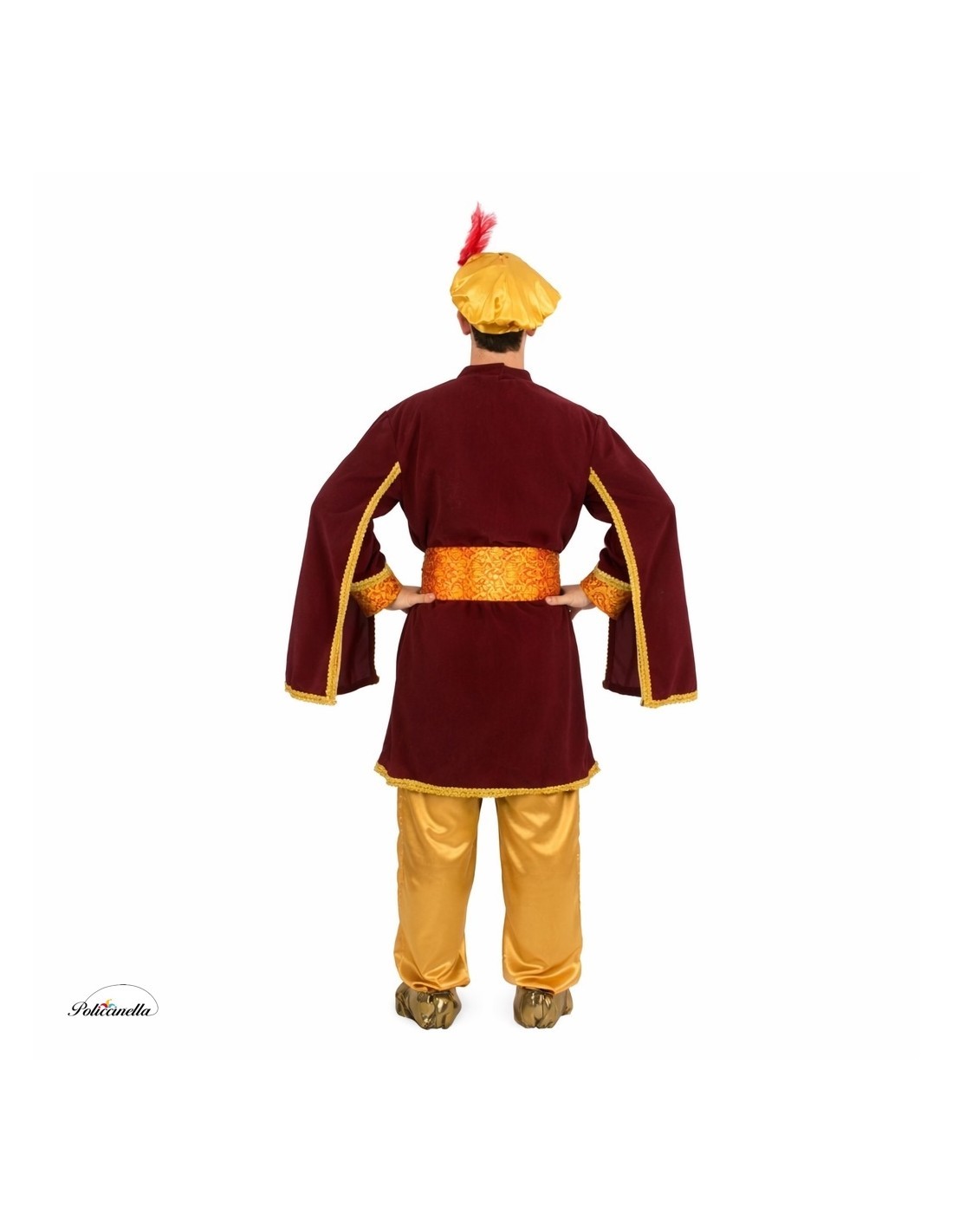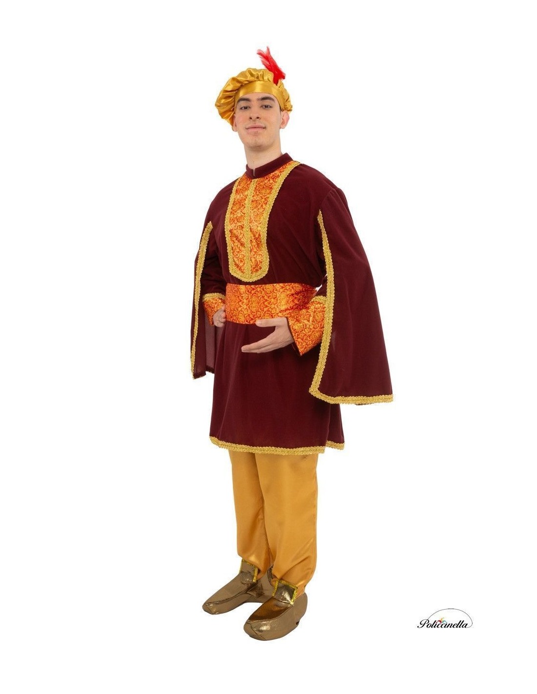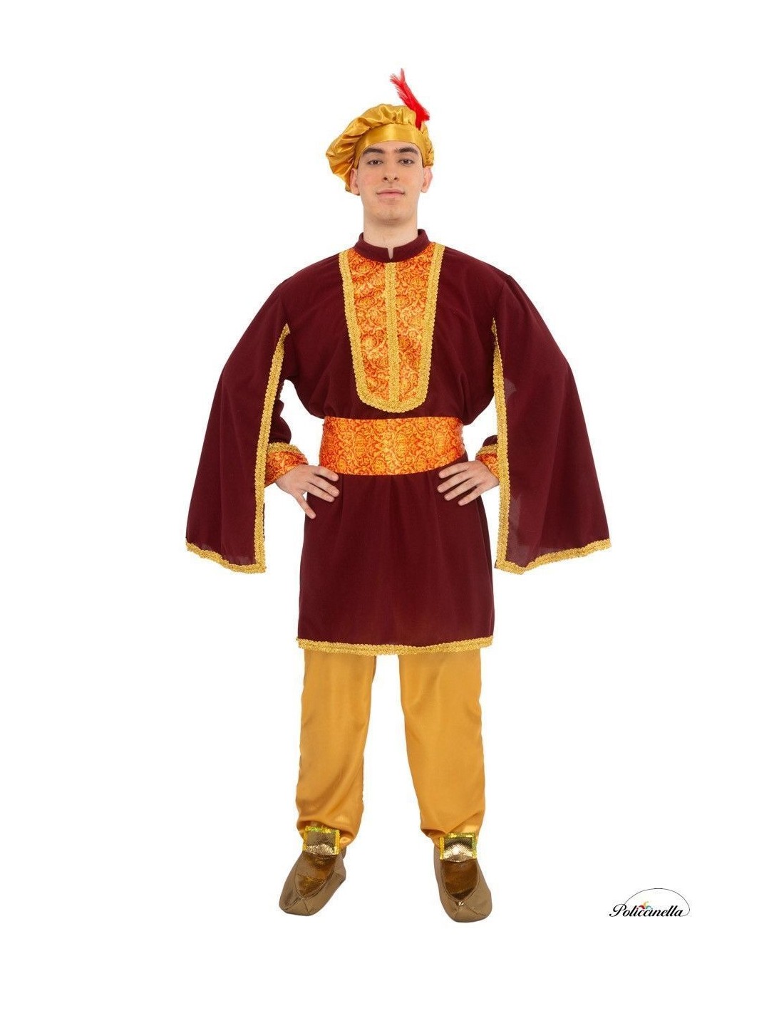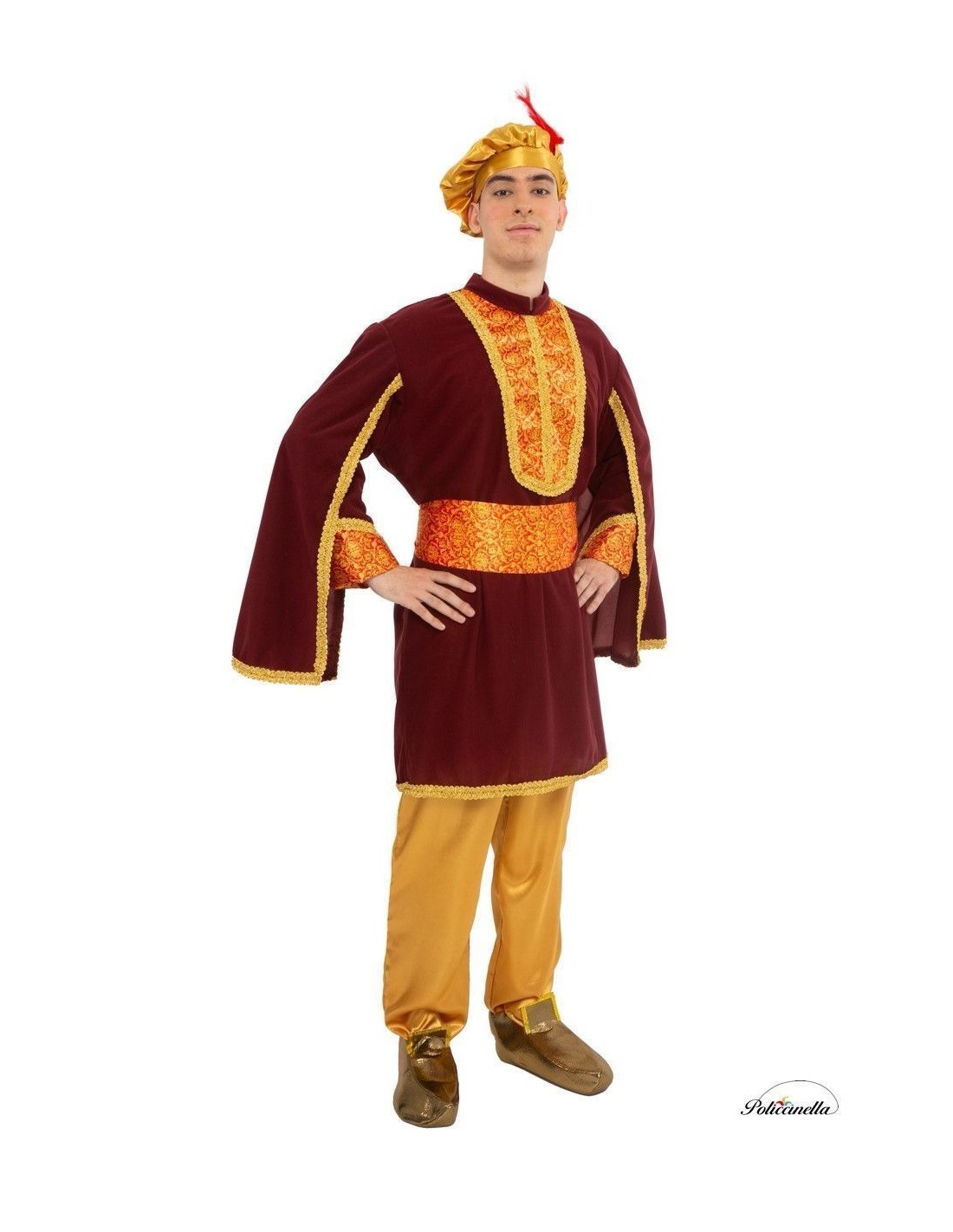 Beeindrucken Sie bei jedem Umzug mit diesem eleganten Kostüm des Pagen Melchior. Sein Jackett aus pfirsichweichem Stoff kombiniert auf der Brust und den Ärmeln eleganten bedruckten Satin, der mit goldener Borte verziert ist. Die capeartigen Ärmel sorgen für Weite und majestätisches Aussehen, während die mit Pailletten verzierten Babuschen und die Mütze mit roter Feder einen festlichen Touch verleihen. Enthalten sind ein verstellbarer Gürtel mit Klettverschluss und eine goldene Hose mit elastischem Bund und praktischer Innentasche. Eine Kreation, die Tradition, Komfort und Eleganz vereint, um bei den Weihnachtsfeierlichkeiten zu glänzen.
