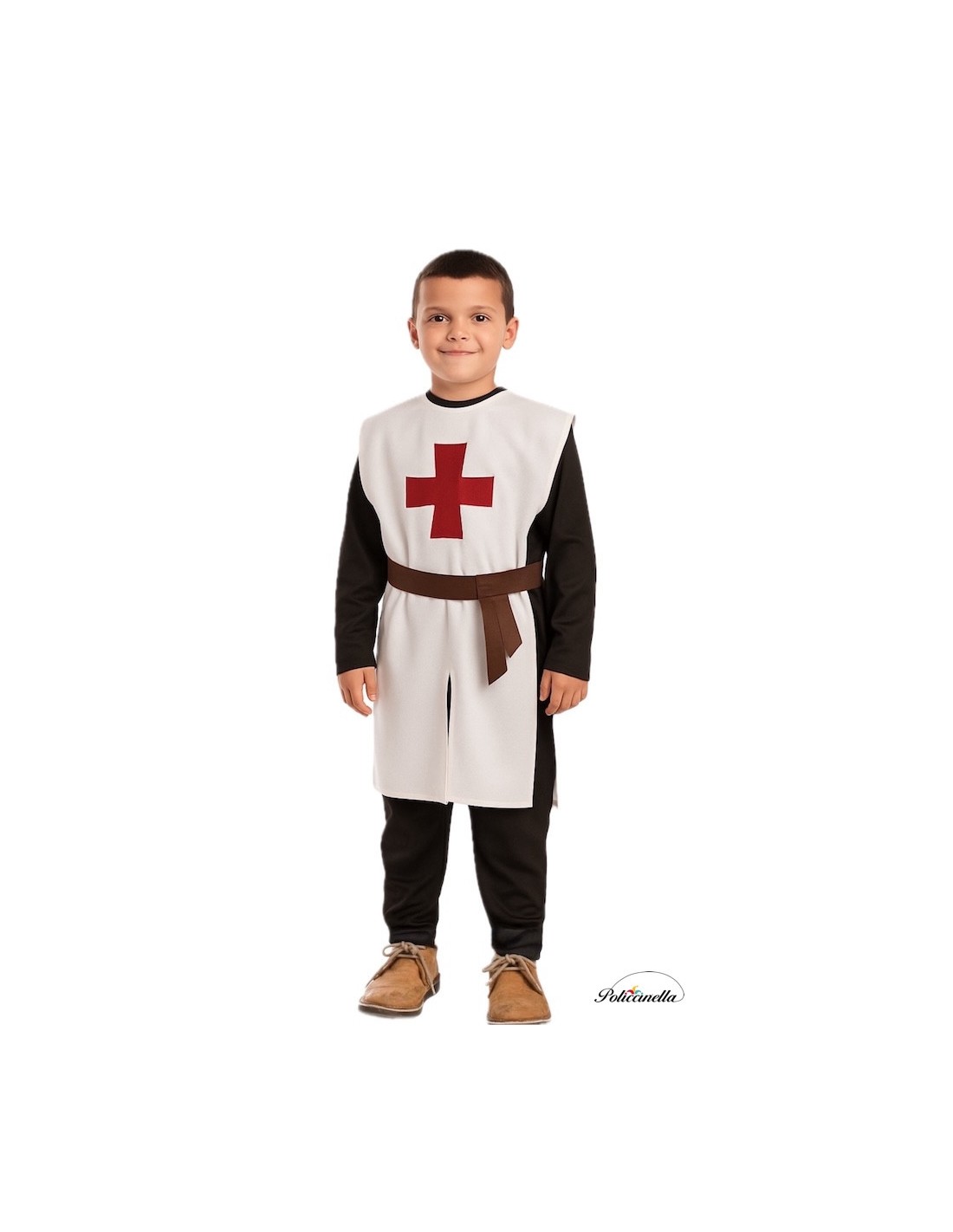 Dieses Templerjacken-Kostüm besteht aus einem ärmellosen, aus Polyester gefertigten Tunic mit einem samtig-weichen Touch in Weiß. Auf der Vorderseite ist ein typisches Templerkreuz aus dichtem, leuchtend rotem Filz direkt aufgenäht. Auf Taillenhöhe sind braune Bänder aus Polyester hinzugefügt, die Lederoptik simulieren und mit Klettverschluss verbunden sind. Eines der Bänder hat zwei kleine Verlängerungen, die wie ein Knoten aussehen. Sowohl der vordere als auch der hintere Saum der Tunic haben Öffnungen, wobei ein Klettverschluss enthalten ist, um eine davon zu schließen und die Passform zu erleichtern.