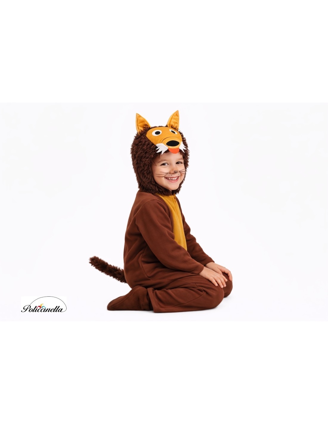 Dieser Ganzkörperanzug mit Kapuze, inspiriert von der Figur eines Wolfs, ist aus robustem Polyester gefertigt und hat einen Reißverschluss vorne. Die Kapuze, die in den Anzug integriert ist, hat in der Mitte Samt mit festen Filterapplikationen, während die Seiten von weichem lockigen Fell bedeckt sind, aus demselben Material wie der Schwanz des Kostüms.