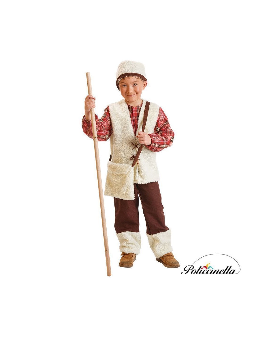 Ein Hirtenkostüm bestehend aus einem Hemd mit integrierter Weste, das aus einem einzigen Stück gefertigt ist. Das Hemd ist aus dichtem Polyester (ähnlich wie Tischdecken) hergestellt, während die vorgetäuschte Weste an der Vorderseite aus einem Stoff mit Schaffell-Optik und dekorativer Zickzack-Schleife besteht. Die Rückseite der Weste ist aus Maschenware gefertigt für zusätzlichen Komfort. Die Hose ist halbelastisch, hat einen elastischen Bund und die Knöchelenden sind mit passenden Schaffellapplikationen verziert. Eine passende Mütze und ein Koordinationsbeutel sind im Lieferumfang enthalten, um das Ensemble ästhetisch abzurunden.