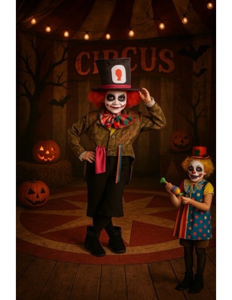 Ein Ensemble aus fünf Teilen: Frack aus Satin, mit einem Tafettaussehen und einem Pfirsichdruck. Revers aus Satin und Frontverschluss mit Klettverschluss. Die Ärmel sind mit Spitze an den Handgelenken verziert, und der Frack hat farbige Schleifen auf Taillenhöhe. HOSE aus dichtem Polyester mit Innentasche und Gummizug in der Taille. Bedrucktes Satintuch zum Binden um den Hals und ein gefoamter Polyesterzylinder, um seine Struktur und Form zu erhalten, mit einem Frontmotiv aus angebrachtem Filter.