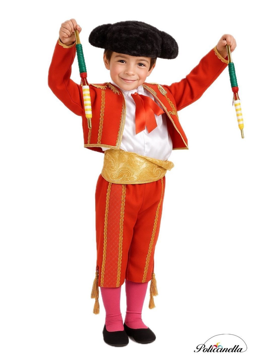 Dieses authentische Kinderkostüm eines Stierkämpfers reproduziert genau den klassischen Anzug des Toreros und zeichnet sich durch die Qualität seiner Verarbeitung und die Fülle seiner Details aus. Der Torero-Anzug ist aus hochdichtem Polyester gefertigt, verziert mit Borten und gesäumt mit goldenem Stoff; die Schulterklappen, ohne Polsterung, haben angenähte Fransen in zwei Stücken, die Realismus verleihen. Die Hose, aus demselben Stoff gefertigt, ist mit Quasten an den Knöcheln verziert. Das Hemd aus weichem Satin ist mit Borten und Spitze verziert, hat einen Reißverschluss hinten und Gummibänder an den Handgelenken für sicheren Halt. Der Gürtel aus Polyester mit einem Brokat-Finish verleiht dem Ensemble Eleganz. Es wird abgerundet durch die klassische Torero-Mütze, aus gestepptem Polyester, um ihre Form zu erhalten, verziert mit Borten und seitlichen Pompons. Ein elegantes und traditionelles Kostüm, ideal für Partys, Aufführungen und Shows.