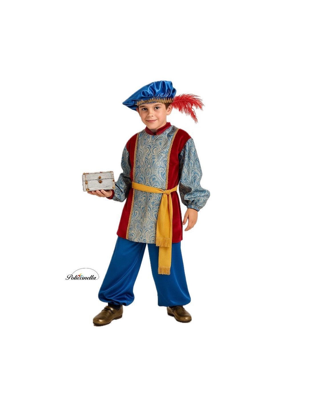 Dieses exklusive Kinderkostüm eines Pagen besticht durch die Eleganz seines Leibchens, das aus leichtem Samt mit kurzen Haaren gefertigt ist und hinten am Hals mit einem Klettverschluss versehen ist. Die Ärmel haben einen elastischen Bund an den Handgelenken. Die Vorderseite und die Ärmel sind mit feinen Verzierungen aus Brokatstoff mit ornamentalen Mustern verziert, die mit goldener Borte verziert sind und einen herrschaftlichen Hauch verleihen. Die Hose, aus elektrisch blauem Satin gefertigt, ist mit Gummibändern an Taille und Knöcheln versehen, was Bewegungsfreiheit und Leichtigkeit bietet. Das Ensemble wird mit einem Satinflicken mit weichen Fransen und einem passenden Turban oder Mütze vervollständigt, die mit Borten gerafft und mit einer seitlichen Feder verziert sind. Eine sorgfältige und majestätische Nachbildung, ideal für Umzüge, Aufführungen und Weihnachtsfeiern.