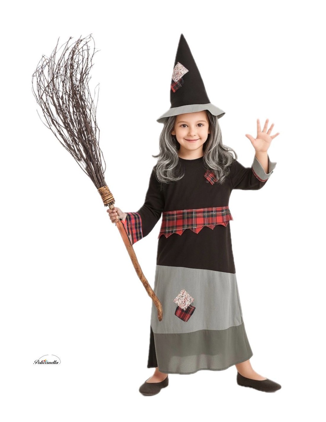 Es handelt sich um ein Kleid aus weichem, halbelastischem Maschenstoff, kombiniert mit Polyester. Der Verschluss erfolgt über ein Klettverschlusssystem auf der Rückseite des Halses. Das Kleid ist mit Stoffstücken verziert, die Flicken nachahmen, und einer Schleife zur Taillenregulierung auf der Rückseite. Das Kostüm wird durch einen charakteristischen Hexenhut vervollständigt, der aus dem gleichen Stoff wie das Kleid gefertigt und mit einem Filter verstärkt ist, um ihm Körper und Struktur zu verleihen. Der Hut ist mit den gleichen Motiven wie der Rest des Kostüms verziert.