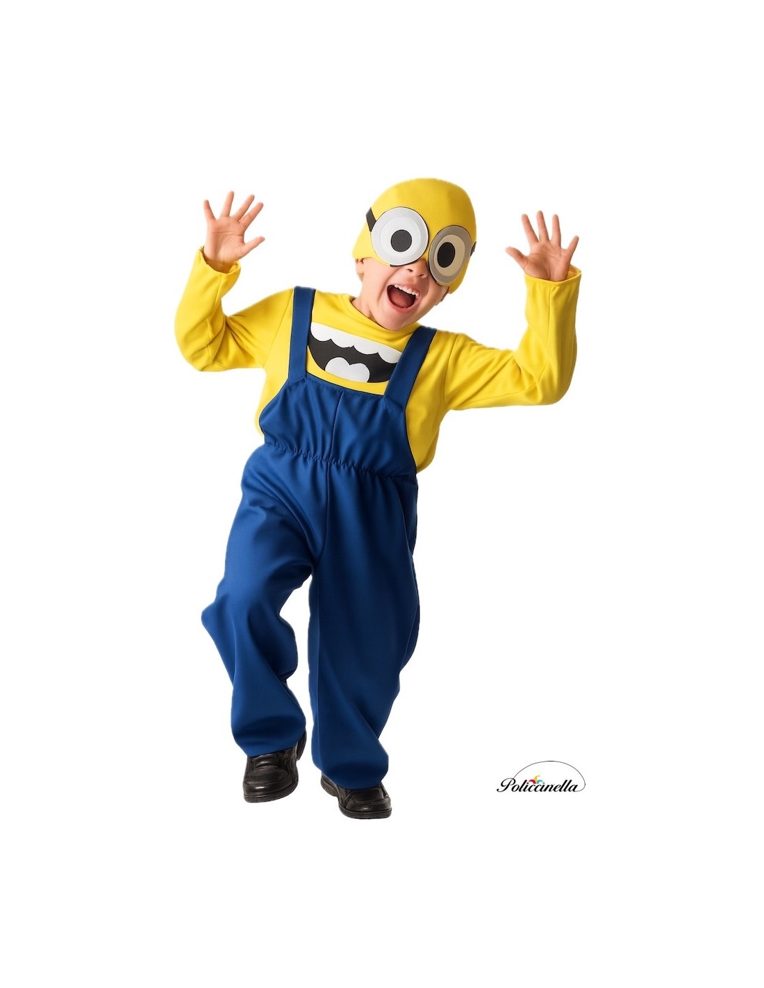 Dieses Minion-Kostüm beinhaltet eine Latzhose aus dichtem blauem Maschenstoff, mit verstellbaren Trägern auf der Rückseite durch Klettverschluss und einem unsichtbaren Reißverschluss im Schritt für mehr Komfort. Es wird kombiniert mit einem weichen gelben Maschenstoffhemd, mit dem charakteristischen Aufdruck, der es auszeichnet, verstellbar mit Klettverschluss auf der Rückseite. Es wird vervollständigt mit einer gestrickten Schaumstoffmütze, um die Struktur und Form zu erhalten, mit dem aufgedruckten Augenmotiv des Charakters und schwarzen Bändern mit Klettverschluss für eine perfekte Passform.