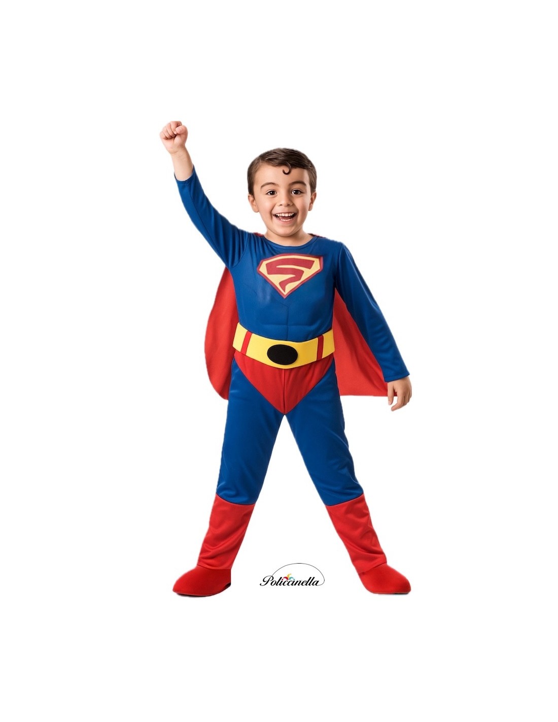 Dieses Superheldenkostüm besteht aus einem Ganzkörperanzug aus weichem Maschenstoff. Es beinhaltet einen vorderen Bereich, der Bauchmuskeln simuliert und mit Polyesterfaser gefüllt ist, um Volumen und Realismus zu verleihen. Der untere Teil der Hose in Rot und die Unterhose, beide aus dem gleichen Stoff wie der Anzug, verfügen über eine Leistenschließung mit verstecktem Reißverschluss für mehr Komfort. Es beinhaltet einen Umhang aus dem gleichen Stoff wie der Anzug, der mit Klettverschluss befestigt wird. Ein gelber, charakteristisch gestalteter Gürtel aus Maschenstoff mit Klettverschluss auf der Rückseite wird hinzugefügt. Der Anzug wird auf der Rückseite mit einem versteckten Reißverschluss geschlossen.