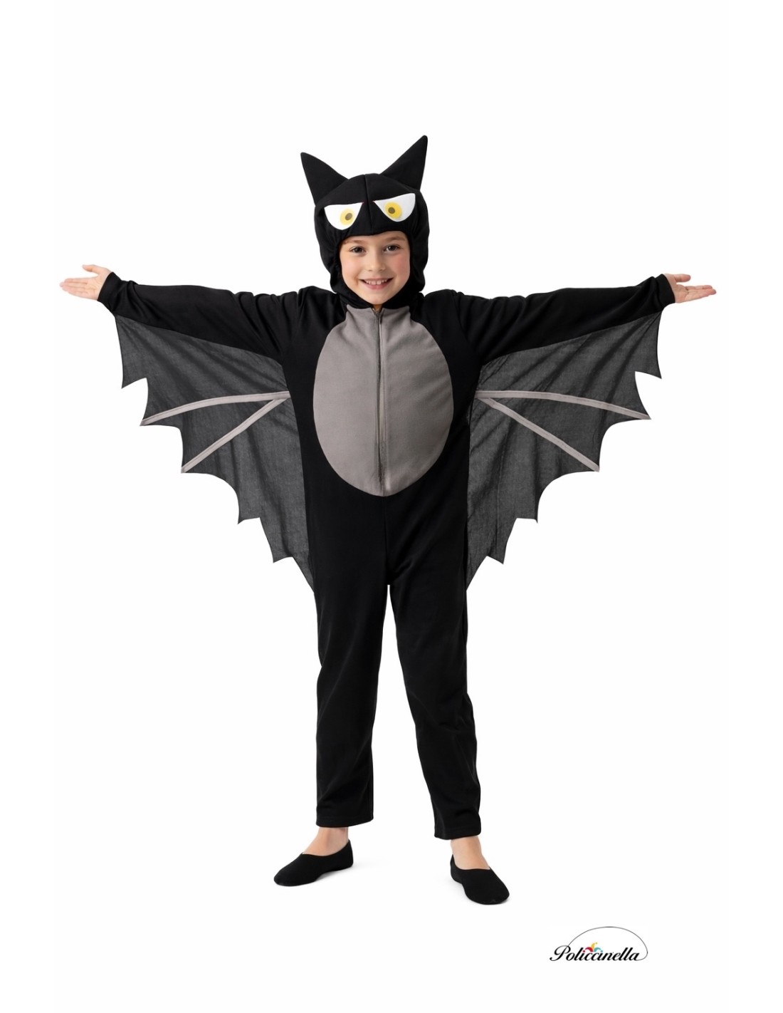 Dieses originelle Kostüm besteht aus einem Ganzkörperanzug, der aus weichem, halbelastischem Maschenstoff mit eingebauter Kapuze gefertigt ist. Die Kapuze ist mit einem Filterstoff überzogen, um eine bessere Konsistenz und Struktur zu gewährleisten. Es verfügt über ein elastisches Band um den Kopf, um sich anzupassen, und sowohl die Augen als auch die Zähne sind am Stoff befestigt und bestehen aus dichtem Filtermaterial. Der Anzug wird vorne mit einem unsichtbaren Reißverschluss geschlossen, und die Vorderseite besteht aus pfirsichfarbenem Polyester. Von den Ärmeln aus verläuft ein Maschenstoff, der die Seiten des Anzugs entlangläuft und die Flügel der Fledermaus bildet.