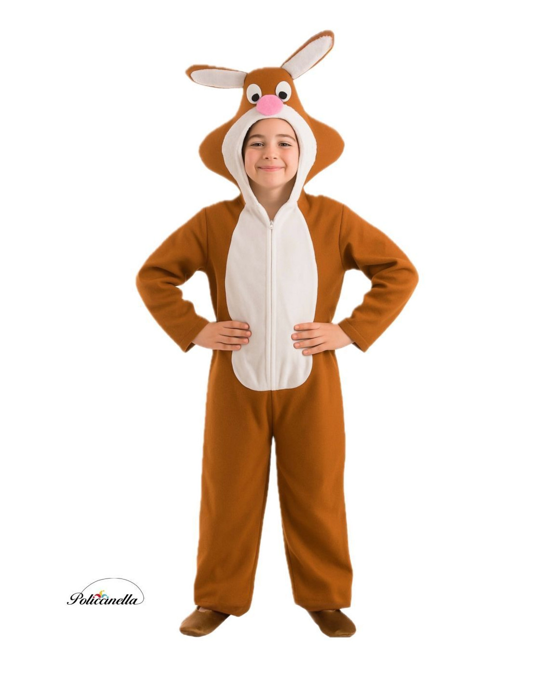 Ein süßes und lustiges Hasenkostüm, bestehend aus einem einteiligen Overall aus Polyester mit einem samtigen Griff und unsichtbarem Reißverschluss vorne. Die integrierte Kapuze ist mit Schaumstoff gefüttert, um ihre Form zu halten, hat Augen und Zähne aus dichtem Filz, Ohren mit festem Füllstoff, damit sie aufrecht stehen bleiben, und eine weiche, flauschige Nase, die am Stoff befestigt ist. Hinten befindet sich eine niedliche Pompon aus Lammfell, der das charakteristische Schwänzchen simuliert. Leicht, bequem und voller Charme.