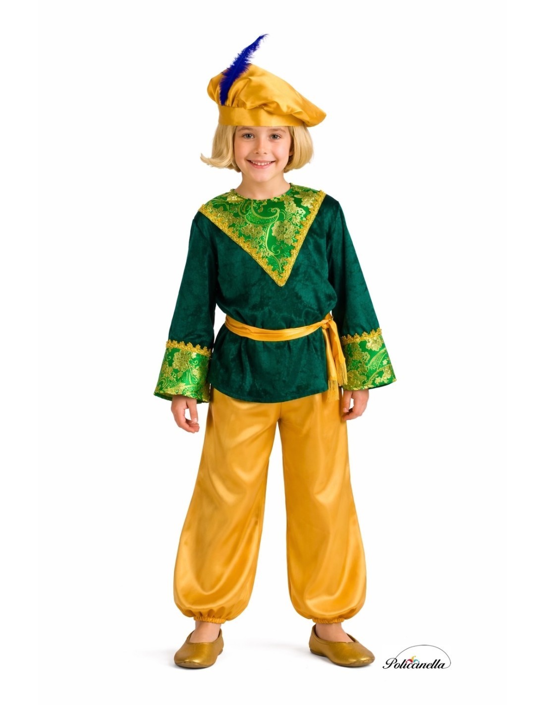 Dieses Kostüm für einen Pagen besticht durch seine hochwertige Verarbeitung und die Eleganz seiner Details. Die Jacke aus weichem grünen Samt ist mit Klettverschluss am Hals befestigt und verfügt über eine spektakuläre Vorderseite und Ärmel, die mit brokatartigem Damaststoff und goldener Borte verziert sind, was ihr ein majestätisches Aussehen verleiht. Die Hose aus goldenem Satin hat einen elastischen Bund und an den Knöcheln für eine bequeme Passform, während der Gürtel ebenfalls aus Satin mit goldenen Fransen verziert ist, die ihm Eleganz verleihen. Die passende, mit einer Feder gekrönte Bommelmütze aus Satin rundet das Ensemble ab. Das Highlight des Kostüms ist zweifellos der luxuriöse Brokat der Jacke, der Authentizität und Noblesse verleiht. Ein weiches, auffälliges und elegantes Outfit, ideal für Umzüge, lebende Krippen und traditionelle Weihnachtsfeiern.