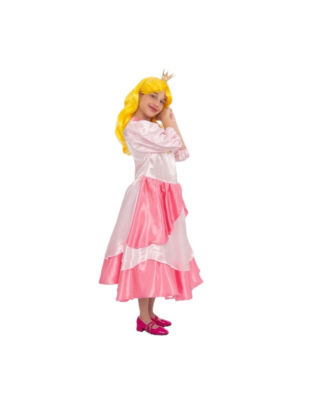 Dieses Kleid, hergestellt aus weichem Satin, besteht aus einem Rock mit mehreren Schichten in verschiedenen rosa Tönen, Puffärmeln mit Gummi am Ellenbogen und einem dekorativen Detail auf der Brust, das an den Stoff geklebt ist. Der Verschluss befindet sich auf der Rückseite und ist ein unsichtbarer Reißverschluss.