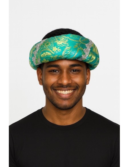 Elegantes Outfit bestehend aus Turban, langem Weste, Hemd, Schärpe, Hose und Schuhüberzügen/Babouches. Es zeichnet sich durch die Qualität seiner Verarbeitung aus, da der Turban, die Weste, der Schmuck am Hemd und die Schärpe aus einem Brokatstoff vom Damasttyp gefertigt sind, der einen herrschaftlichen und königlichen Hauch verleiht. Die silberne Borte, die diese Teile umrandet, betont noch mehr ihren visuellen Reichtum. Das Hemd und die Hose aus weichem Satin sorgen für Komfort und eine raffinierte Passform, während die Babouches aus Schaumstoff, die dafür gedacht sind, ihre Form zu bewahren, mit einer zarten Paillettenborte verziert sind. Ein majestätisches Ensemble, das Distinktion, Tradition und Qualität in jedem Detail widerspiegelt.
