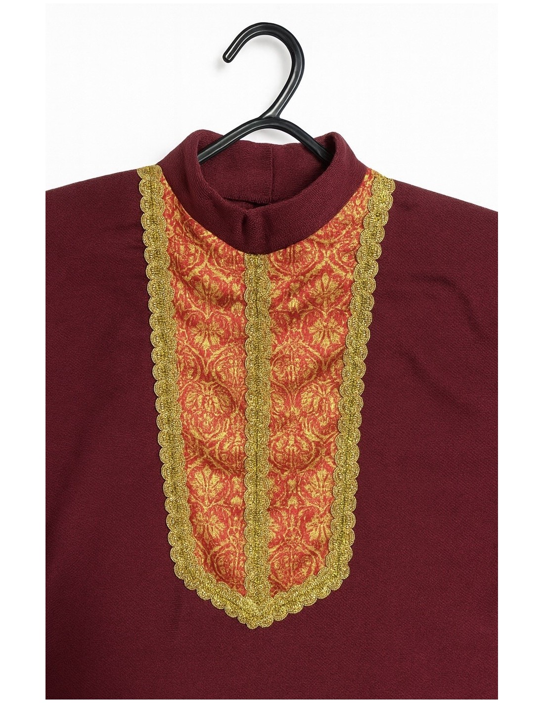Jacke aus einem samtig-weichen Stoff kombiniert mit bedrucktem Satin auf der Brust und den Ärmeln, mit goldenen Borten verziert. Die Ärmel sind in Capeform geschnitten, um mehr Abdeckung und einen königlicheren Look zu bieten. Genauso wie die Pantoffeln, die mit Pailletten verziert sind, und die Mütze mit rotem Federbesatz. Sie kommt mit einem Gürtel, der mit Klettverschluss angepasst werden kann, und einer goldenen Hose mit elastischem Bund und kleiner Innentasche.