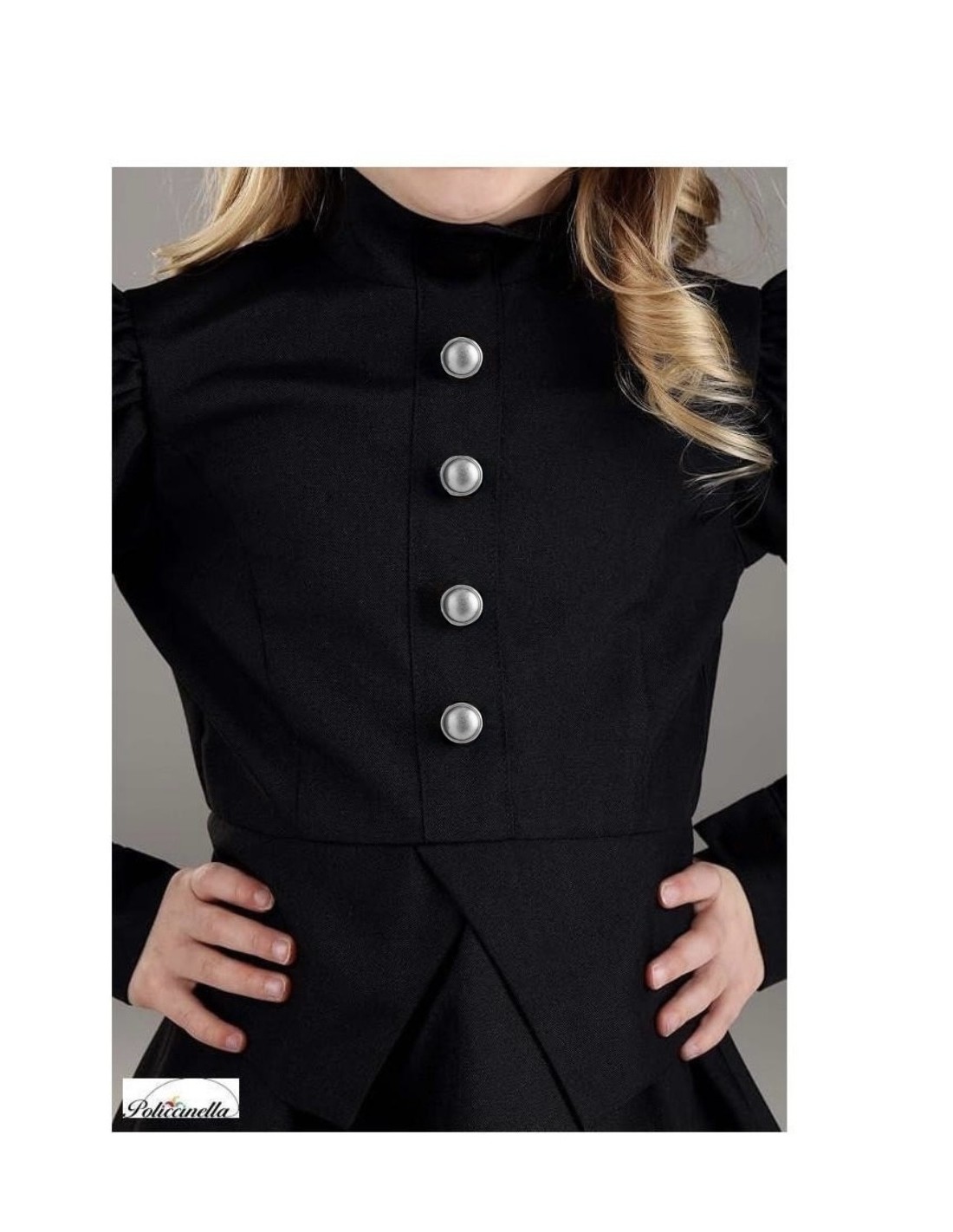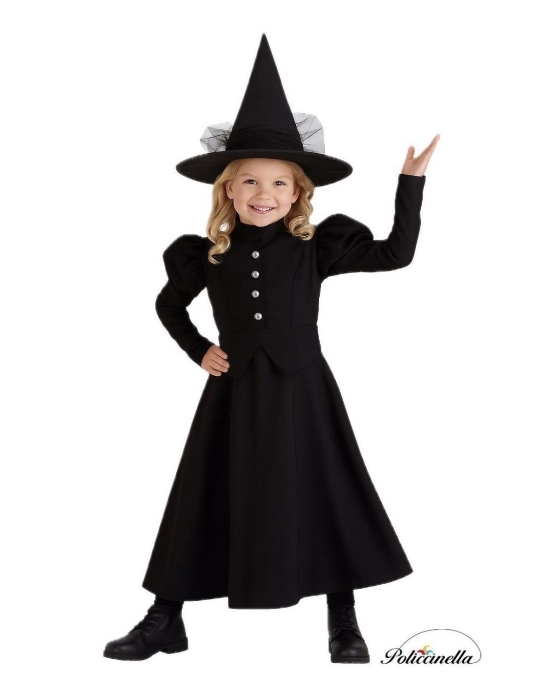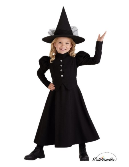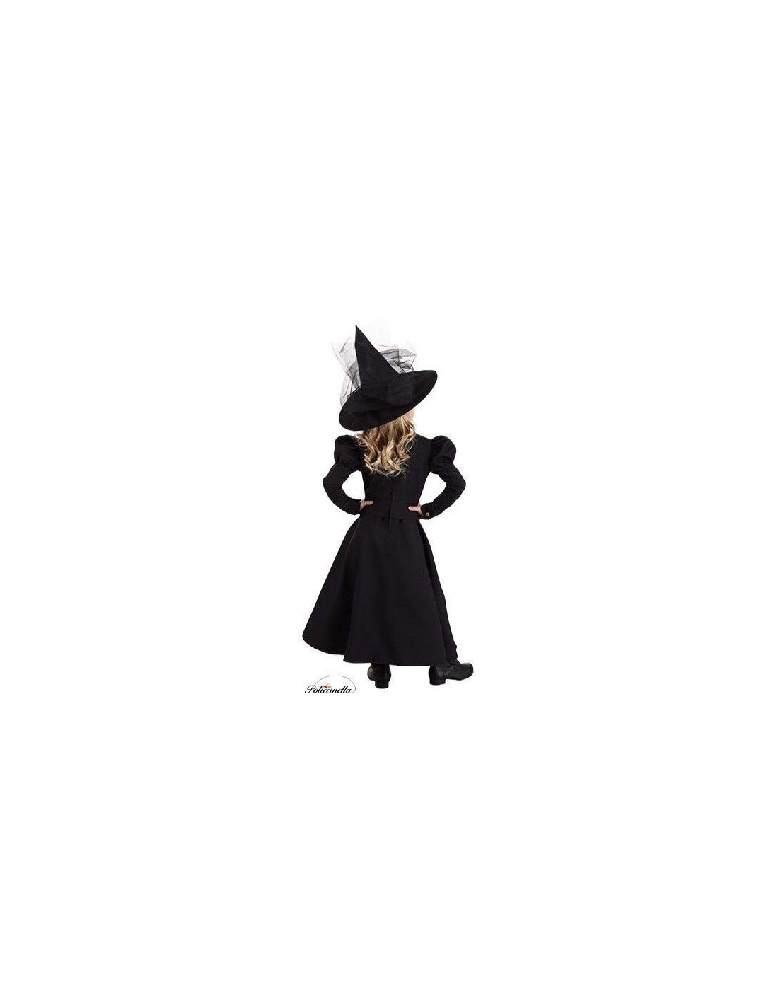 Ein Ensemble, das Mysterium und Eleganz vereint. Das Kleid, gefertigt aus weichem und dichtem Polyester, präsentiert sich in einem langen Design mit elastischer Taille für bequemen Sitz. Die Ballonärmel und die dekorativen Knöpfe vorne verleihen einen klassischen Touch, während der hohe Kragen und der Klettverschluss am Rücken für einen makellosen Abschluss sorgen. Das Ensemble wird durch einen Hut aus robustem Satin vervollständigt, mit einem inneren Ring, der seine Form hält, und schwarzem Tüll, der bis zur Taille reicht. Die leicht gebogene Spitze verleiht einen anmutigen und einzigartigen Look, ideal für thematische Partys oder Halloween.