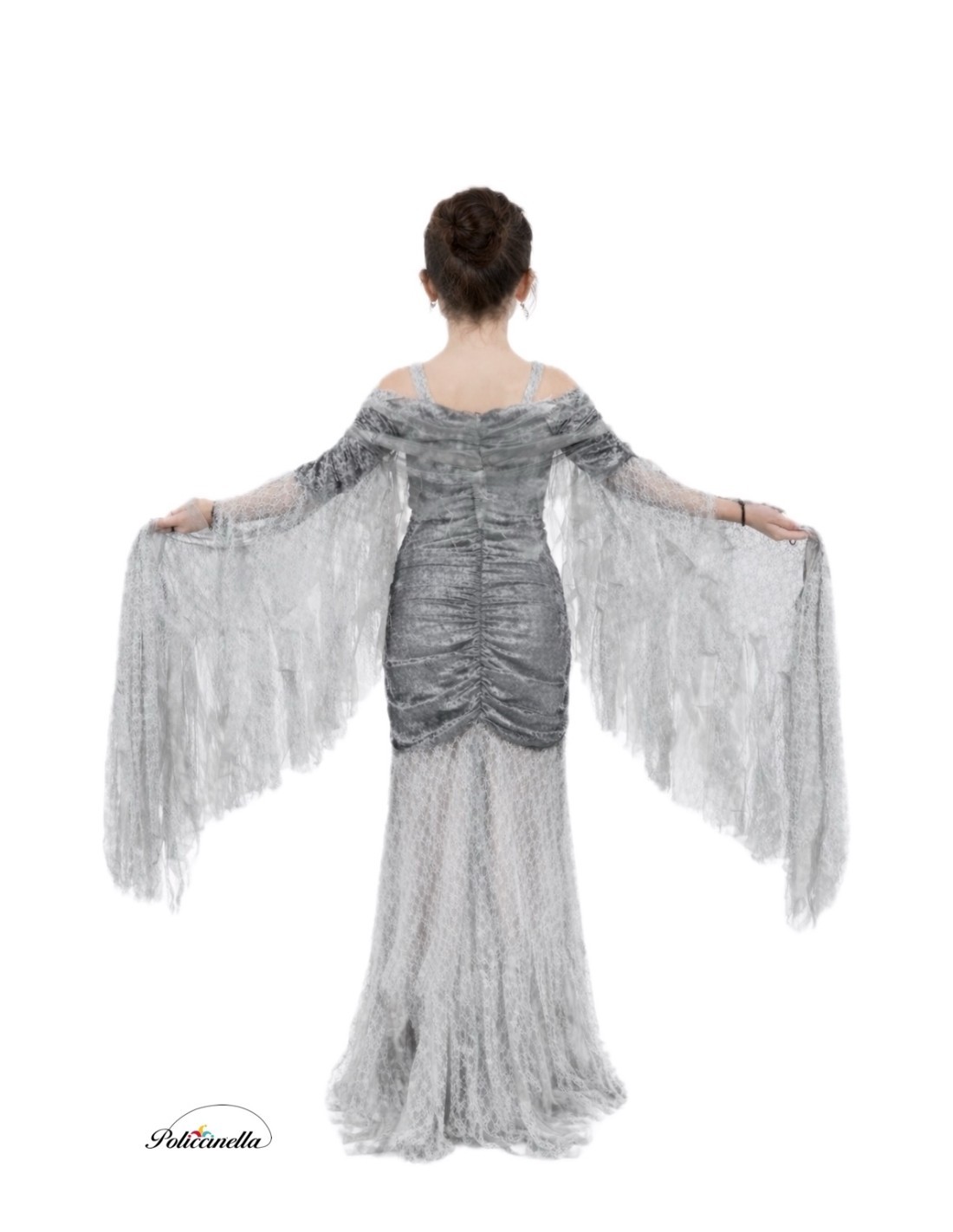 Eingehüllt in einen Hauch von Geheimnis und Fantasie wird dieses wunderschöne Kostüm eines Gefallenen Engels jedes Mädchen sich magisch fühlen lassen. Das Kleid, aus weichem, drapiertem und halbelastischem Samt gefertigt, passt bequem zu verschiedenen Silhouetten, bietet Bewegungsfreiheit und eine bezaubernde Passform. Die langen Flügel, entlang der Ärmel genäht, öffnen und schließen sich mit der Bewegung der Arme, als ob sie wirklich fliegen könnte! Eine verstellbare Schultergarnitur aus Chiffon verleiht eine zarte Note, während der Rock aus Spitze und Chiffon, leicht und ohne Transparenz, einen luftigen und eleganten Effekt erzeugt. Ein Ensemble voller Stil, Geheimnis und himmlischem Spaß.