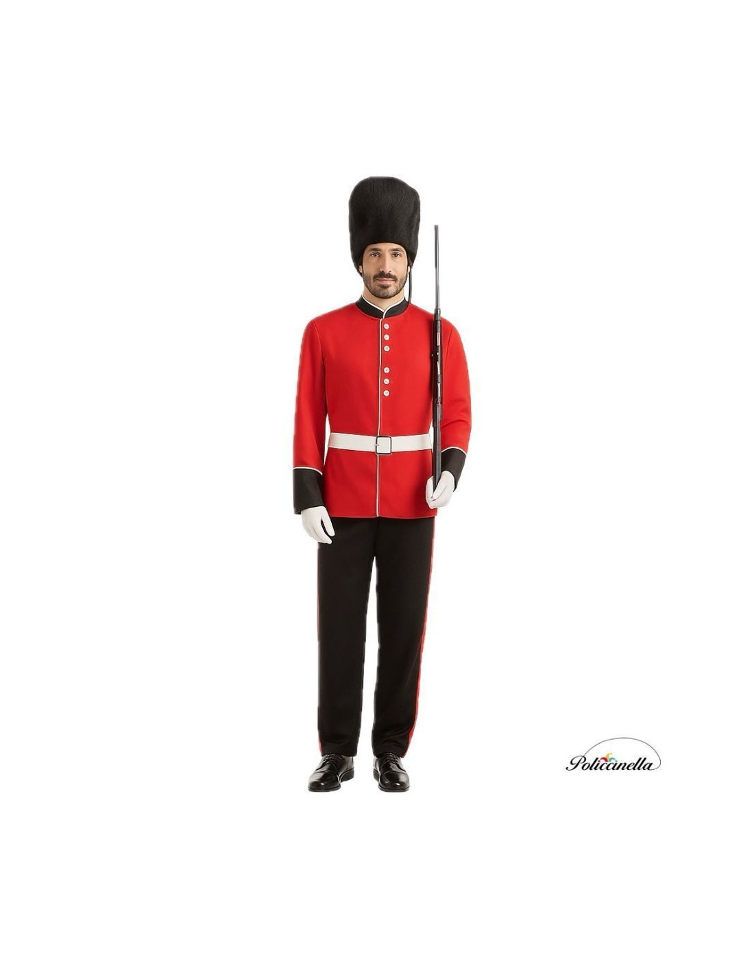 Klassisches Kostüm der britischen Wache, elegant und mit allen Details der traditionellen Uniform. Enthält eine dichte, aber weiche Polyesterjacke mit Mao-Kragen, verziert mit weißen Bändern und Knöpfen, mit Klettverschluss am Nacken. Die Hose, aus weichem halbelastischem Stoff mit Gummizug in der Taille, hat rote Satinbänder an den Seiten. Komplettiert wird das Kostüm mit einem lackähnlichen Gürtel mit silberner Plastikschnalle und der markanten Mütze mit synthetischem Fell, die das Charakteristikum der Figur darstellt, gefertigt aus einem Strickstoff mit Gummizug an der Rückseite für einen bequemen Sitz.
