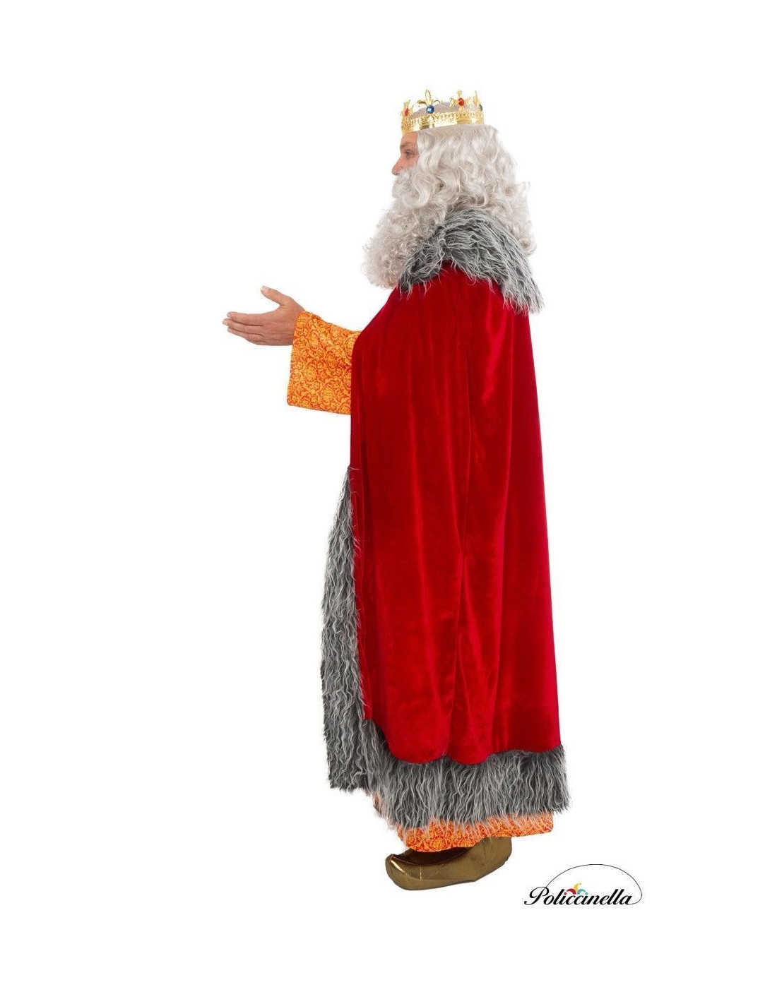 Dieses majestätische Kostüm des Königs Melchor strahlt die Größe und Feierlichkeit eines Monarchen des Ostens dank der Qualität seiner Stoffe und Verarbeitung aus. Die lange Jacke aus rotem Satin mit zartem goldenem Muster verleiht dem Outfit einen königlichen und leuchtenden Hauch. Darüber liegt ein imposanter Samtumhang, verziert mit dichtem lockigem grauem Fell, das die Eleganz und Distinktion des Ensembles betont. Der Samtgürtel, verziert mit einem Frontdetail und einem Klettverschluss auf der Rückseite, garantiert Komfort, ohne die Noblesse der Erscheinung zu verlieren. Das Outfit wird mit goldenen Babuschenschuhüberziehern vervollständigt, die aus Schaumstoff gefertigt sind, um ihre makellose Struktur zu erhalten und ein gleichmäßiges Finish zu bieten. Ein qualitativ hochwertiges Kostüm, ideal für Umzüge und Aufführungen, die einen authentischen und edlen Stil erfordern.