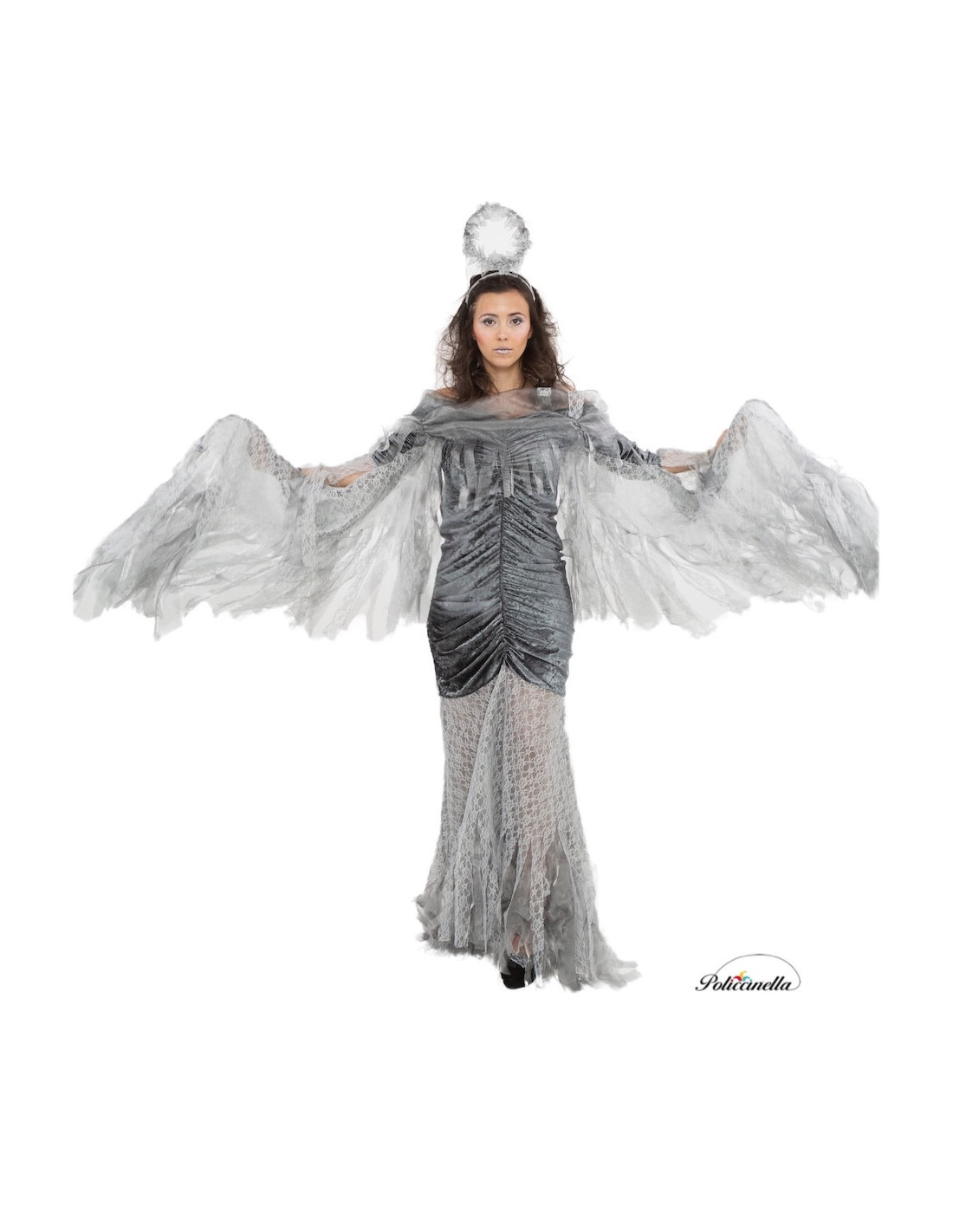 Eingehüllt in ein Geheimnis umgebendes Halo, kombiniert dieses spektakuläre Kostüm des Gefallenen Engels Eleganz und Charakter. Das Kleid aus drapiertem, halbelastischem Samt passt bequem von Größe 36 bis 42 und verfügt über einen seitlichen Reißverschluss sowie verstärkte Brustpartie für eine sichere Passform. Eine verstellbare Chiffon-Schulterpolster verleihen zarte Eleganz, während die Flügel entlang der Arme genäht sind und mit einem elastischen Armband am Handgelenk und Finger befestigt sind, um jede Bewegung mühelos zu begleiten. Der Rock, luftig und ätherisch aus Spitze und Chiffon, bietet Leichtigkeit und Präsenz ohne Durchsichtigkeit und kreiert ein beeindruckendes und anspruchsvolles Gesamtbild.