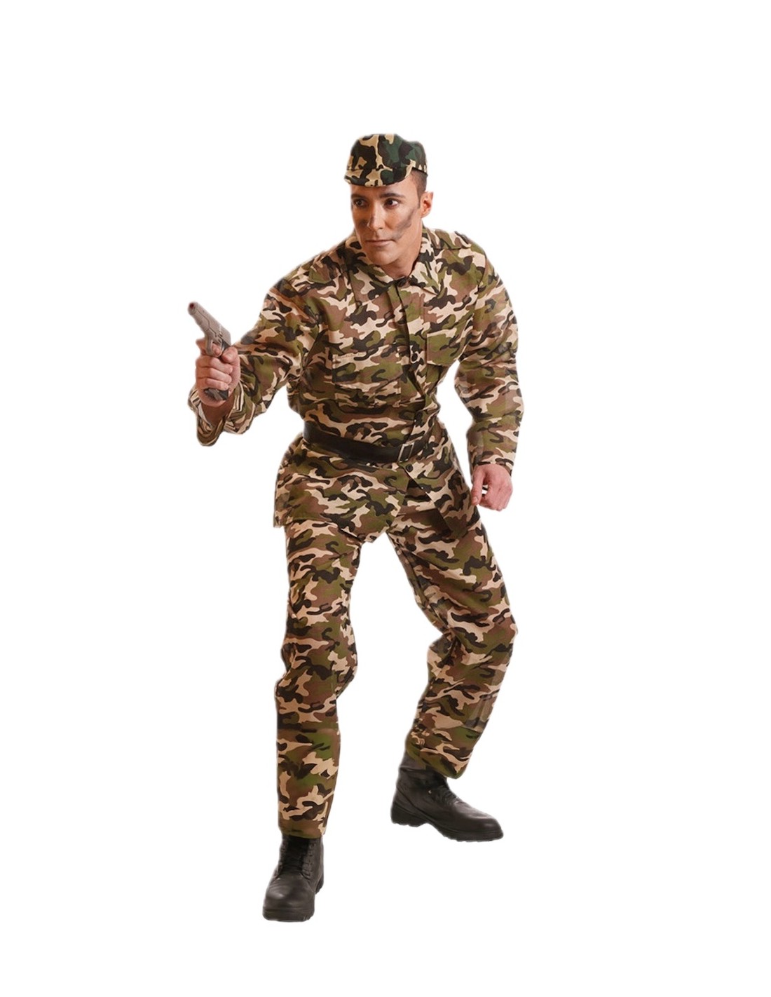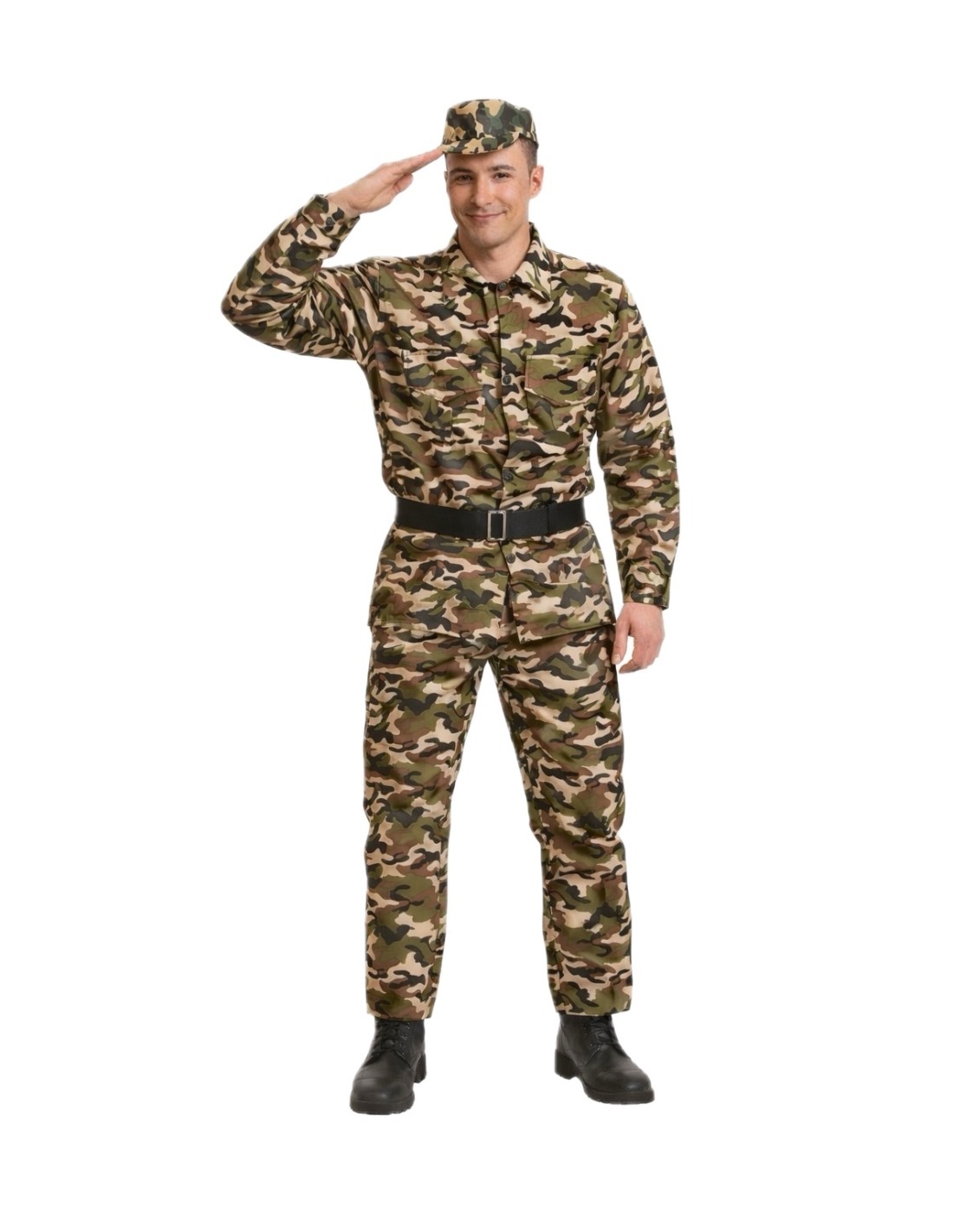 This outfit, composed of four pieces, is made of a resistant but soft waxed-effect polyester and features a straight cut. The jacket closes in the front with buttons and has two large pockets (which are not fake) at chest level. The pants, with an elastic waistband, have a small internal pocket. The ensemble is completed with a cap made of the same fabric as the rest of the outfit. It also includes a black belt made of polyester on filter fabric, simulating leather, with a metal buckle.