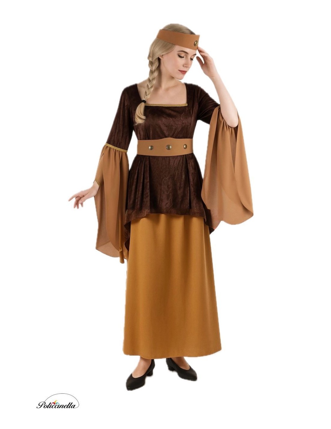 This elegant medieval costume, made of soft velvet and peach-like touch fabric, consists of a long jacket with a square neckline decorated with golden trim. The sleeves, typical of the medieval era, open up from the elbow and are also decorated with trim. The bottom part of the costume includes a long skirt with an elastic waistband for better fit and a small internal pocket. The outfit is complemented with a foam belt decorated with pieces that simulate bronze and a velvet bow at the back. Finally, a foam turban is included with the same ornament as the belt, which has a small elastic at the back for better adaptability to the head.