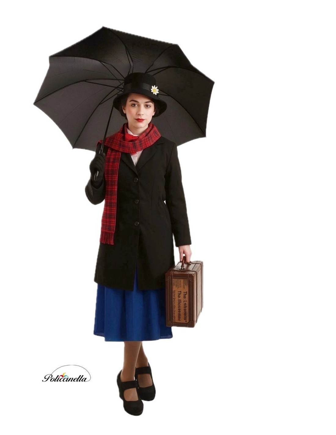 This beautiful costume is composed of several pieces: a frock coat-style JACKET made of dense and soft polyester, with elastic at the waist for better adaptability, closure with velcro system and decorative buttons; a white CHEST made of soft machine-knit fabric with a bow tie and necktie that is placed under the jacket, creating the optical effect of a shirt; a dense and semi-elastic SKIRT with elastic at the waist and a small interior pocket; and finally, the outfit is completed with a dense scarf and a hat made of a soft but resistant felt to maintain its structure.